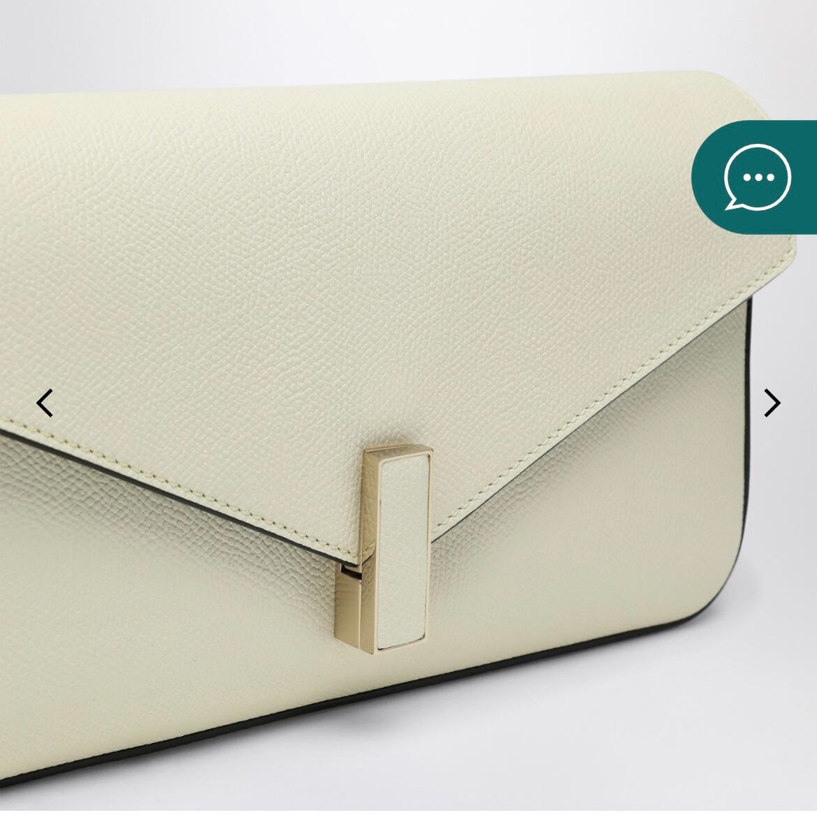 ヴァレクストラのアイボリーカーフスキンクラッチバッグ。ゴールドの留め具が付いた フロントフラップとレザーインサート、調節可能・取り外し可能なレザーショルダー ストラップ、そしてフラットな内側のカードポケットが特徴です。