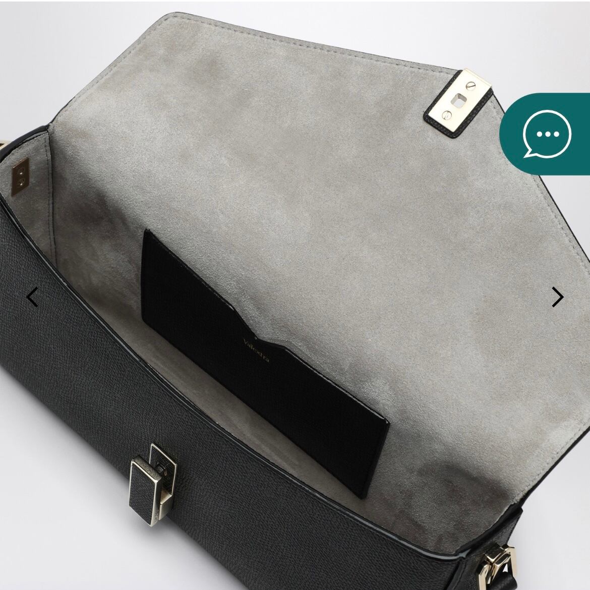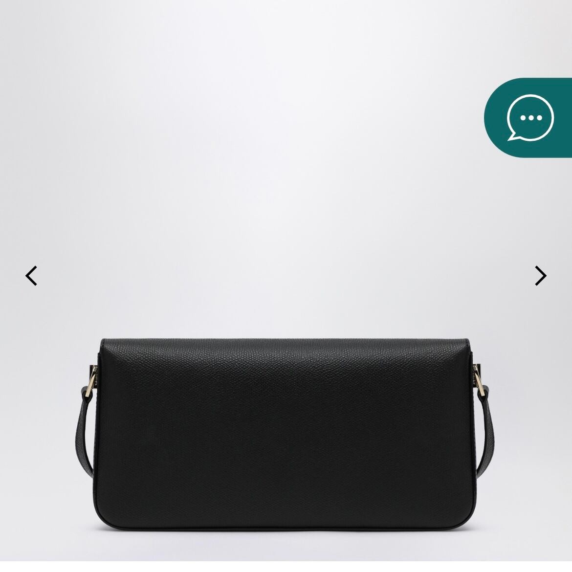 ヴァレクストラのブラックカーフスキンクラッチバッグ。ゴールドの留め具が付いたフロント フラップとレザーインサート、調節可能で取り外し可能なレザーショルダーストラップ、 そしてフラットな内側のカードポケットが特徴です。