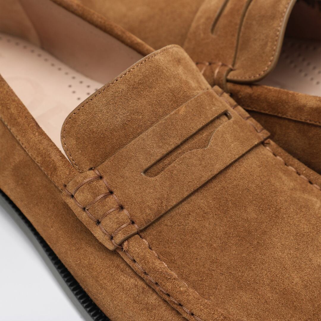 モカ色のスエードを使用したロエベのモカシン。非対称の花びら型の丸いつま先、トーンオントーンのステッチ、レザーソールが特徴です。