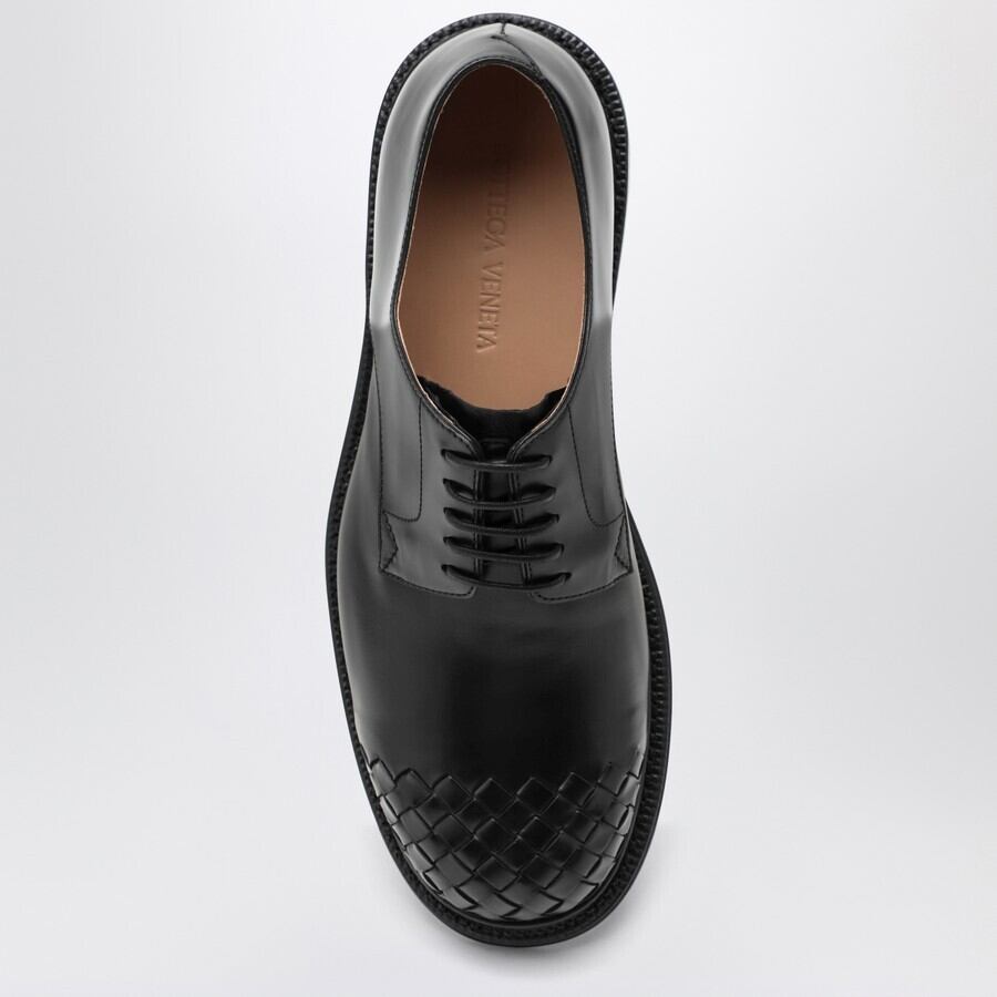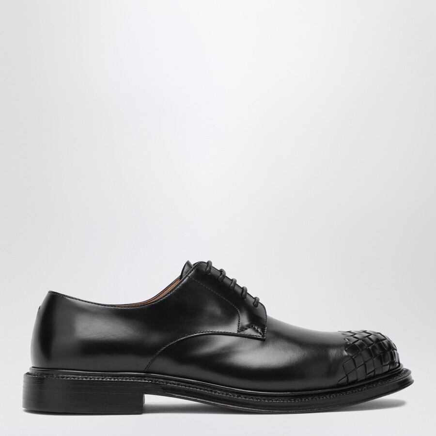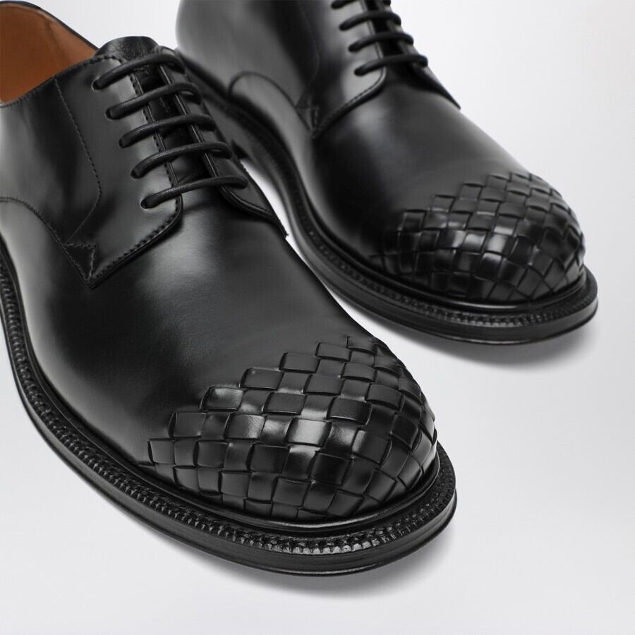 ボッテガ・ヴェネタのブラックレザー製レースアップシューズ。イントレチャート模様のラウンドトゥ、レースアップクロージャー、レザーソールが特徴です。