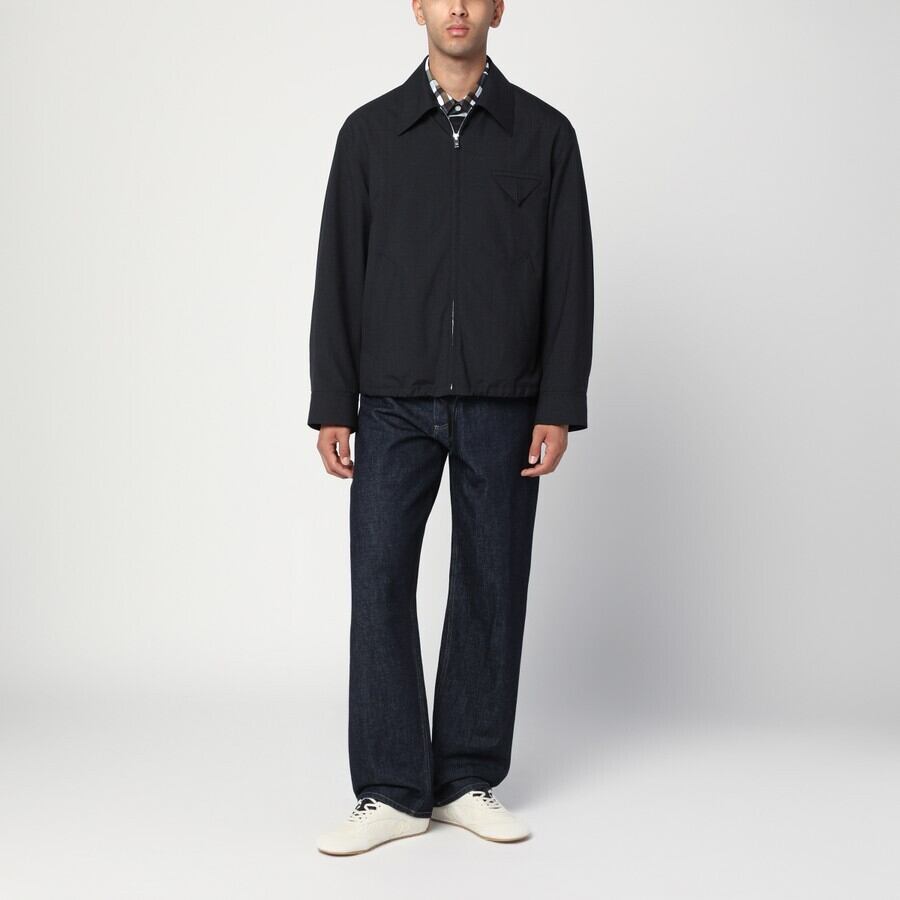 ボッテガ・ヴェネタのブラックウールジャケット。クラシックな襟、フロントジップ、ボタン留めの袖口が付いた長袖、両サイドにウェルトポケット、ドローストリングヘム、胸元にトライアングルロゴのディテールが特徴です。