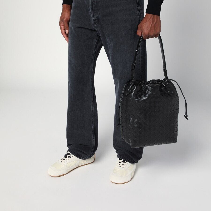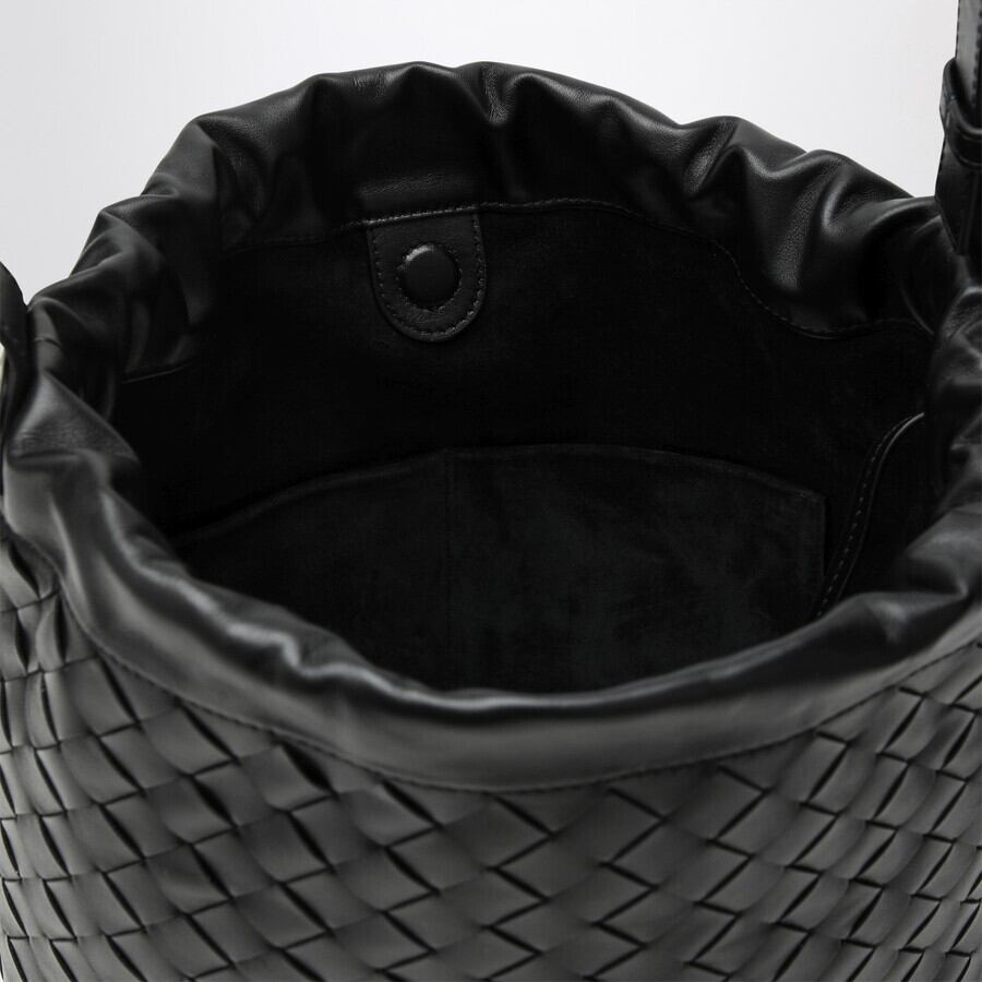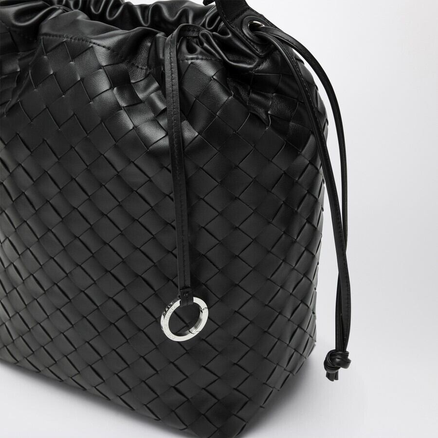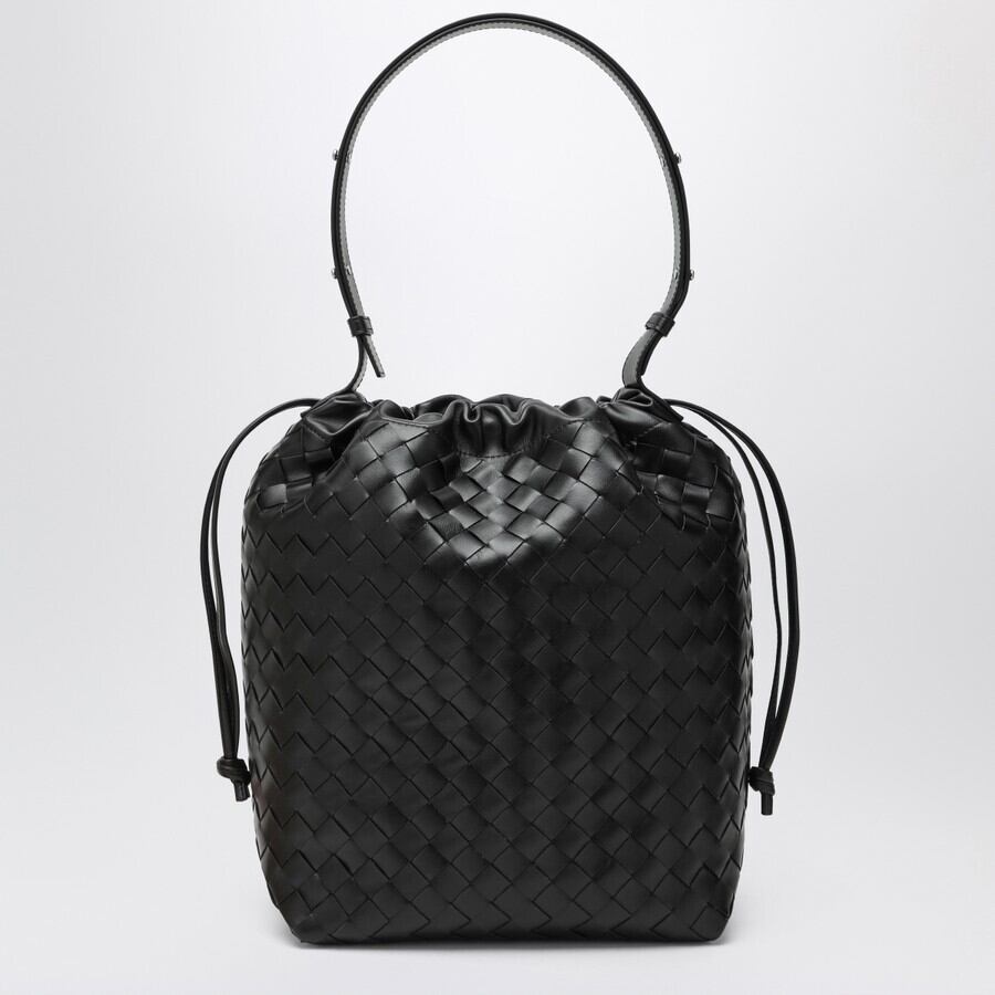 ボッテガ・ヴェネタのバケットバッグ。イントレチャート模様のブラックレザーを使用。調節可能なトップハンドル、マグネットボタン開閉、ドローストリング、メタルキーリングが特徴です。