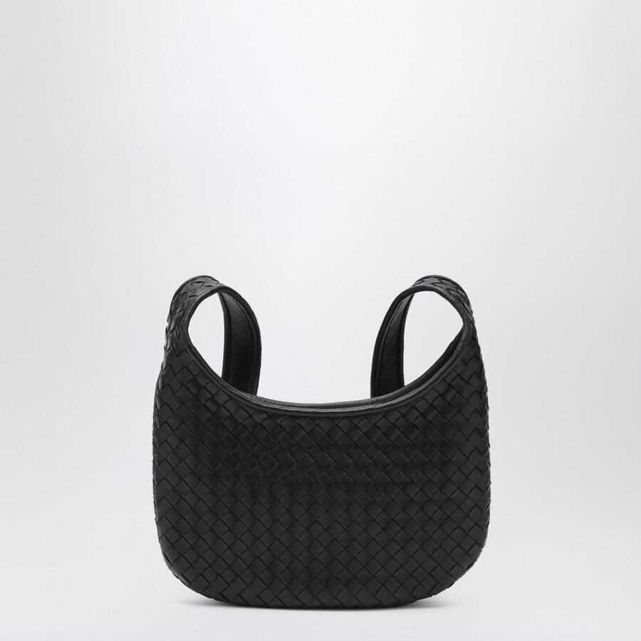 ボッテガ・ヴェネタのスモール クロスボディバッグ。ブラックのイントレチャート模様があしらわれたラムスキンレザーを使用。丸みのあるシルエット、内側にジップポケット、ジップ開閉、スエードの内側、シルバーの金具が特徴です。