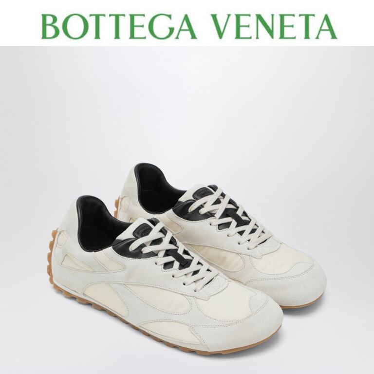ボッテガ・ヴェネタのローカットスニーカー。ベージュとブラックのスエードとナイロンを使用。ラウンドトゥ、ロゴパッチ付きのタン、コントラストの効いたホワイトのシューレース、ラバーソールが特徴です。
