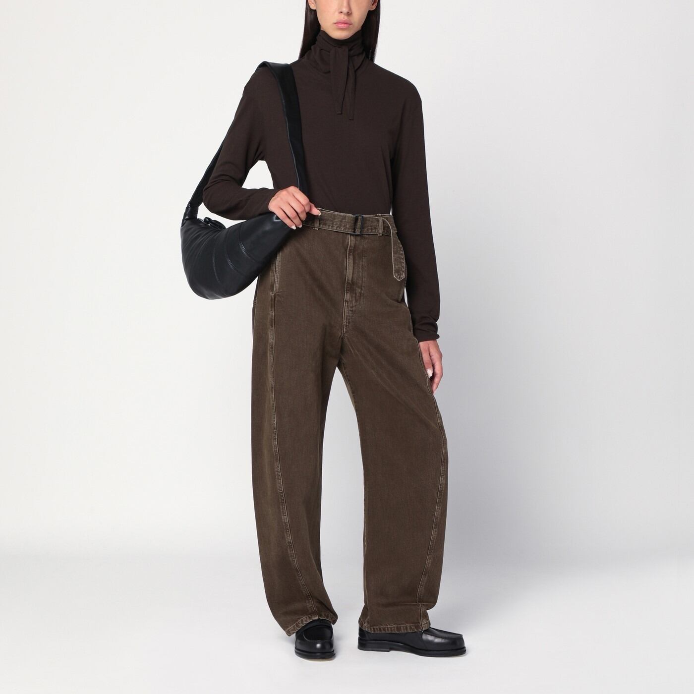 モスグリーンのコットンデニムを使用したルメールパンツ。丸みを帯びた脚のシルエット、同系色のウエストバンド、ウェルトサイドポケット、バックポケットが特徴です。