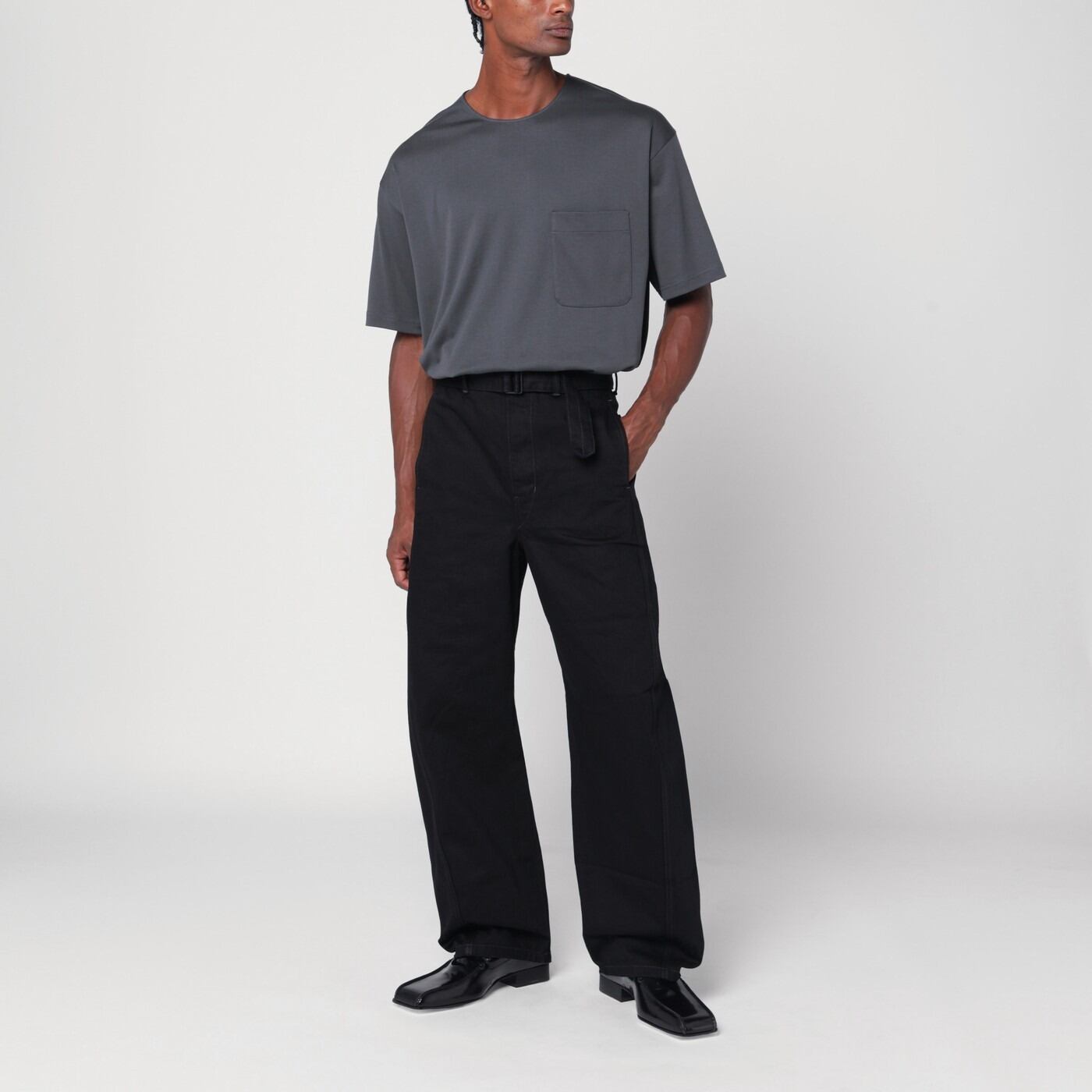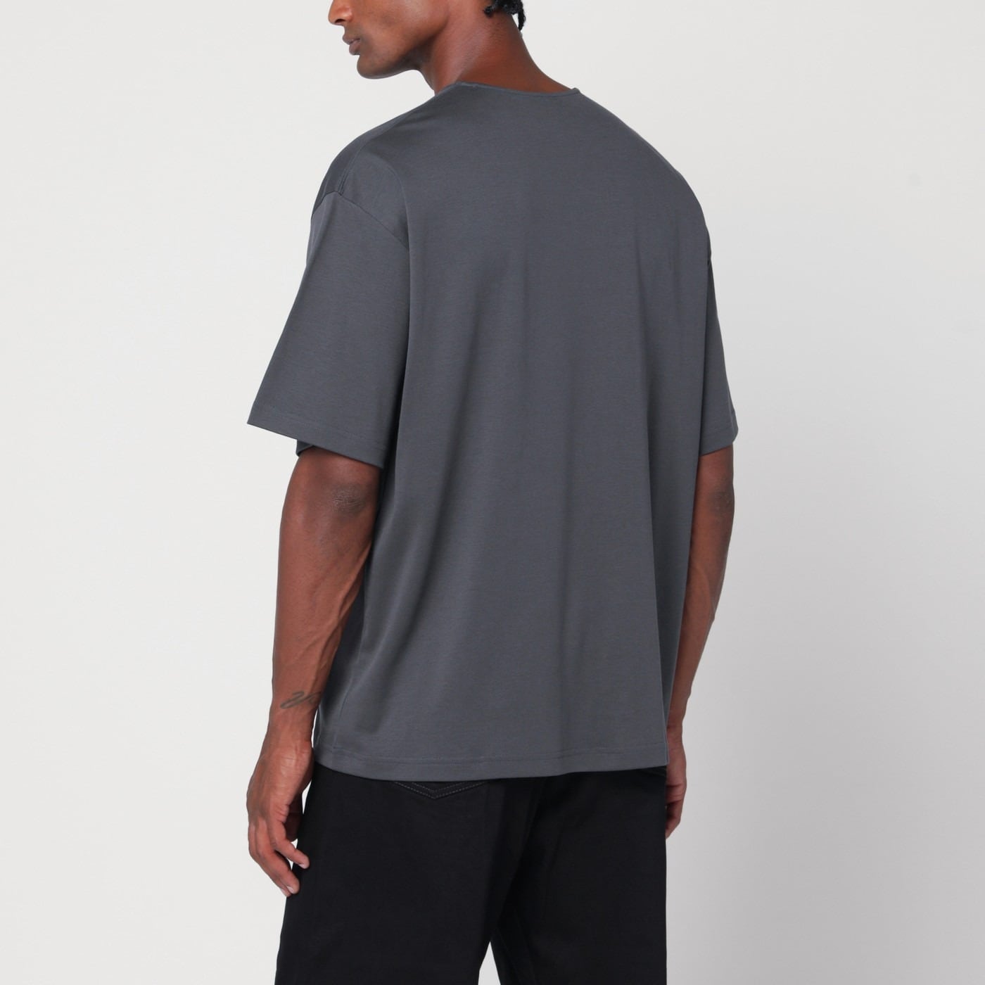 LEMAIREのチャコールグレーのコットン&シルク製クルーネックTシャツ。半袖で、胸にパッチポケットが1つ付いています。