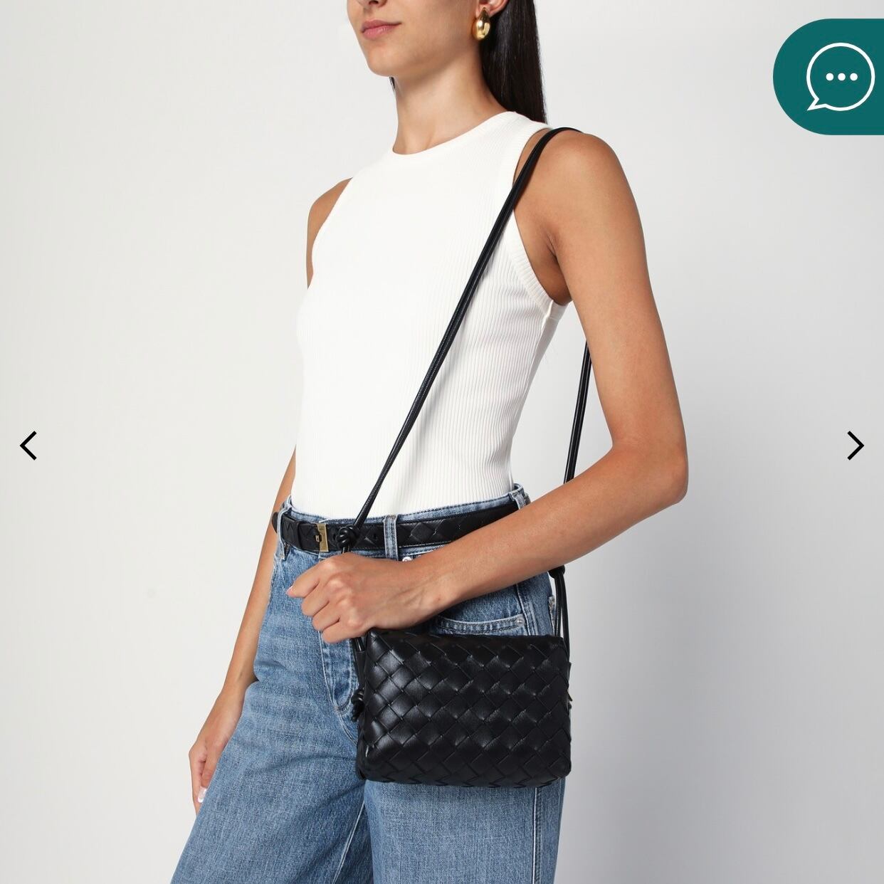 ボッテガ・ヴェネタのブラックレザークロスボディバッグ。イントレチャートデザイン、 ジッパー開閉、結び目付きストラップが特徴です。
