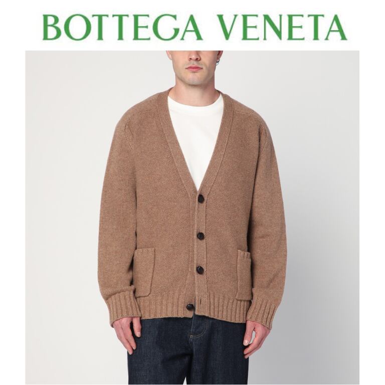 ボッテガ・ヴェネタのキャメルウールカーディガン。Vネック、織り模様のレザーボタンでフロントを留めるデザイン、フロントポケット、長袖、リブ編みの袖口と裾が特徴です。