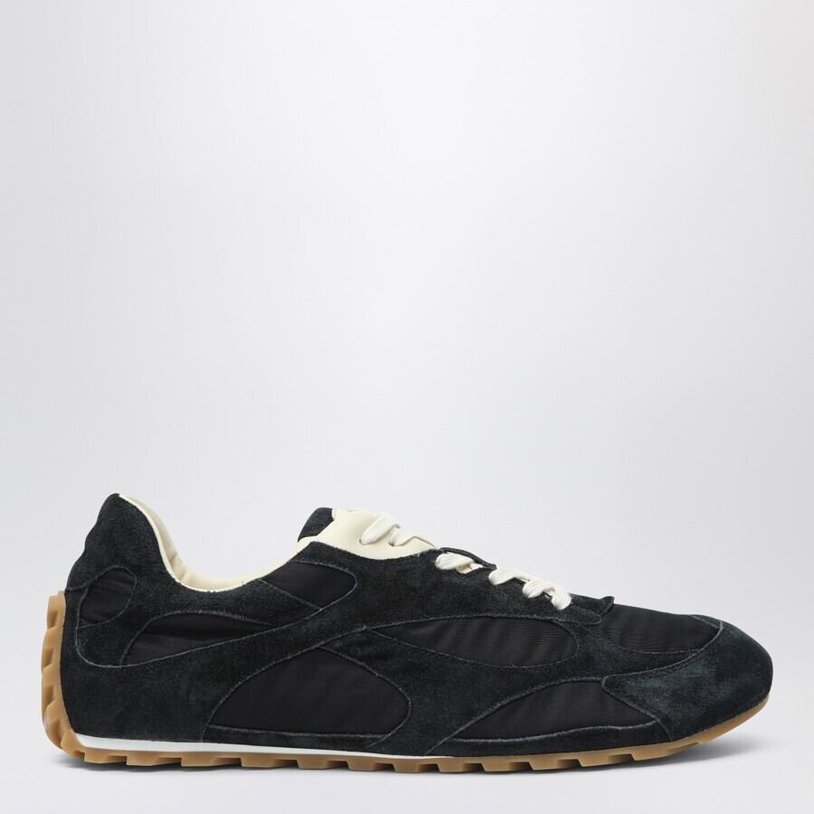 ボッテガ・ヴェネタのブラックスエードとナイロンを使用したローカットスニーカー。ラウンドトゥ、ロゴパッチ付きのタン、コントラストの効いたホワイトのシューレース、ラバーソールが特徴です。