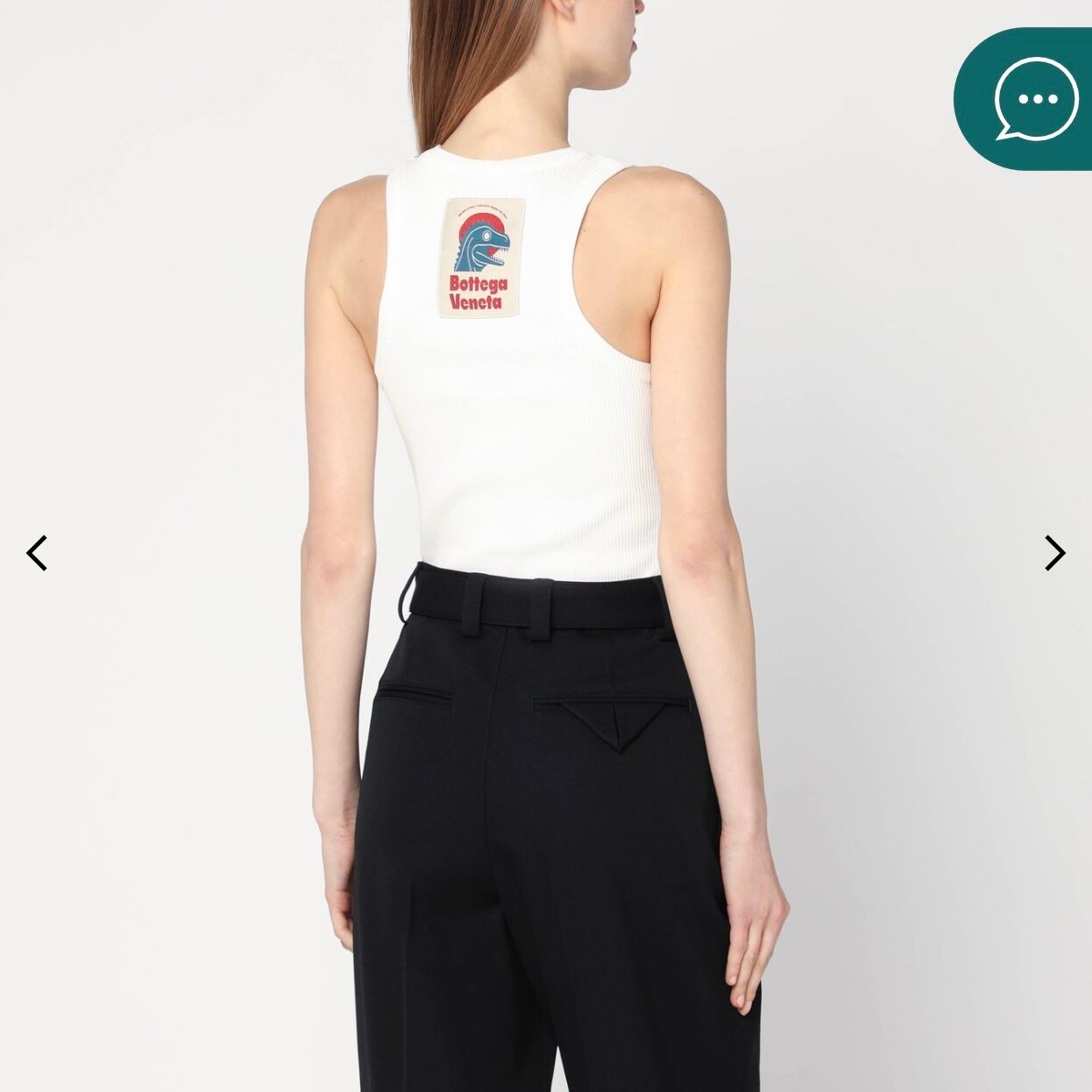 ボッテガ・ヴェネタのアイボリー コットン混紡 クルーネック タンクトップ。リブ編み のデザインと背面の大きなロゴパッチが特徴です。