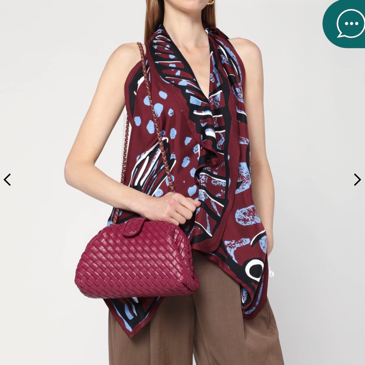 ボッテガ・ヴェネタのシナバーカラーのパッド入りレザー製スモールクラッチ。イントレチャート 模様、チューブ状のレザーとメタルチェーン、シングルコンパートメント、 マグネット式フラップ開閉が特徴です。
