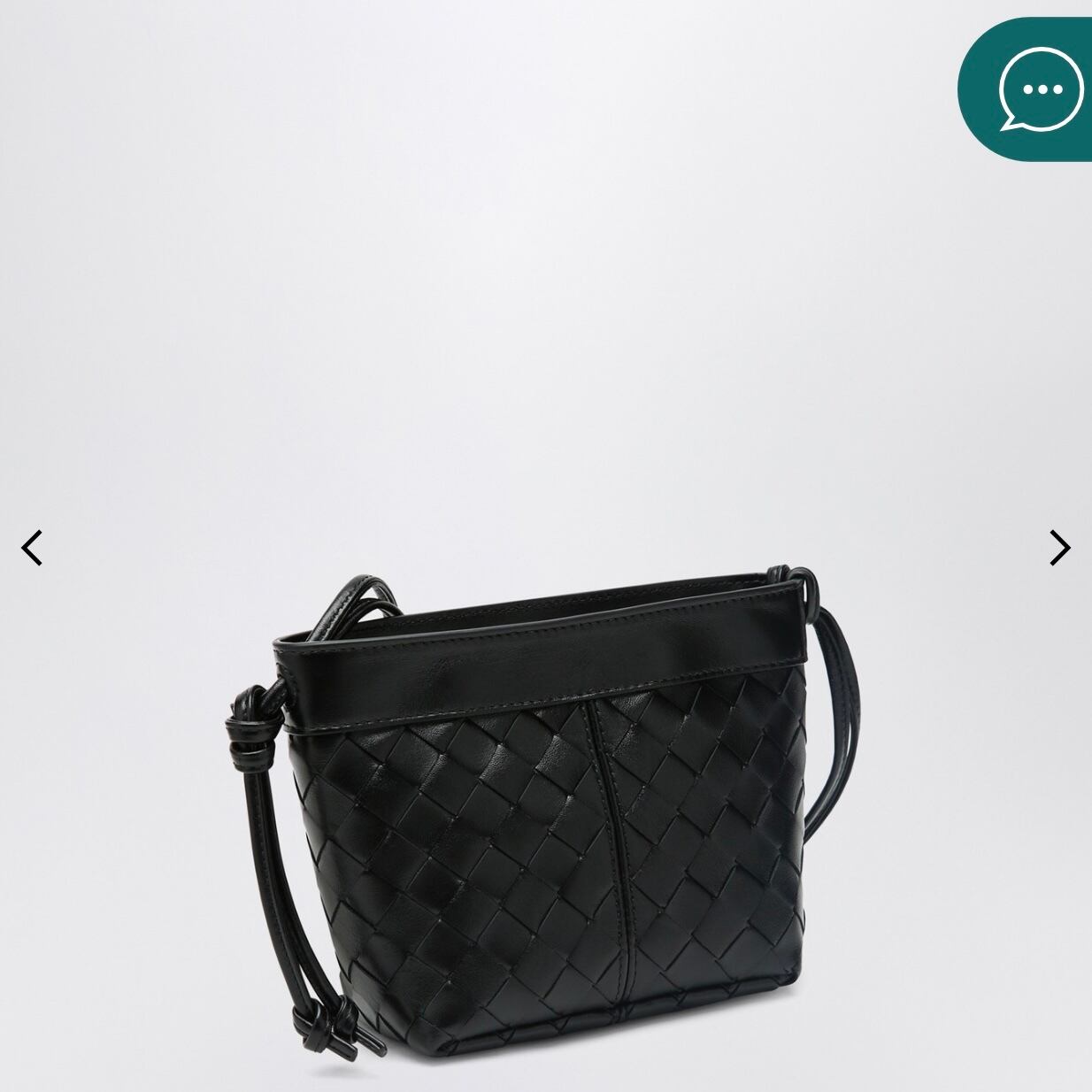 ボッテガ・ヴェネタのスモールクロスボディバッグ。イントレチャート模様のブラック レザーを使用。細いショルダーストラップ、ジッパー開閉、キャンバスライニング、 内側にジッパーポケットが付いています。