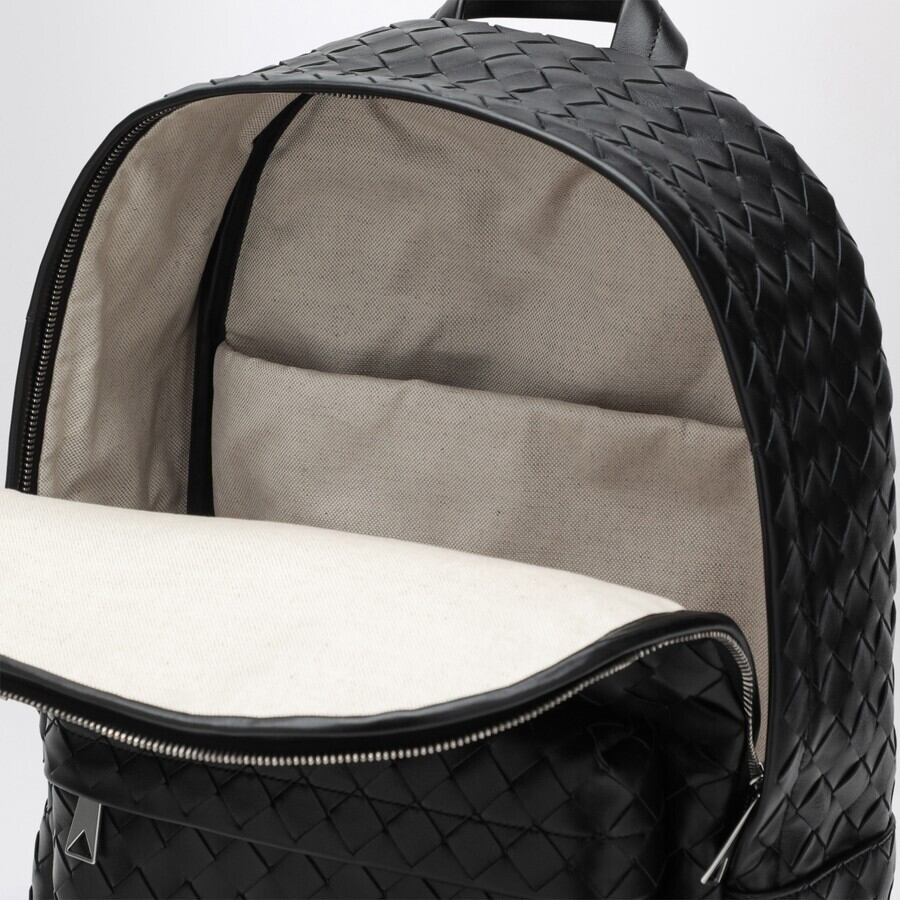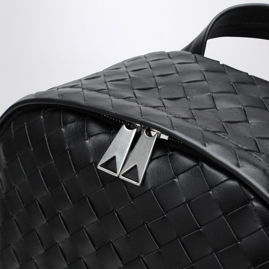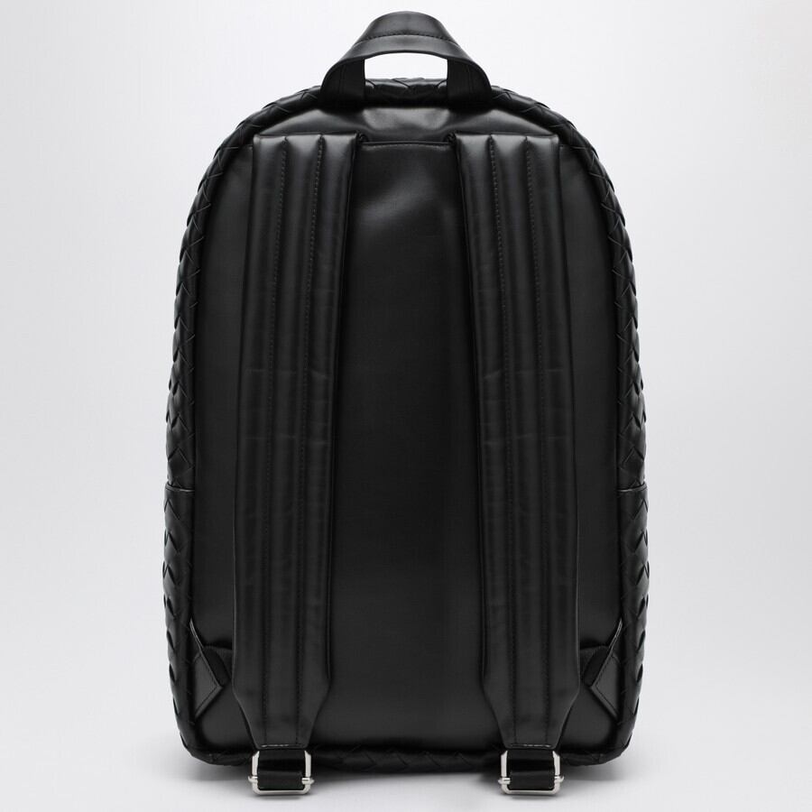 イントレチャート模様のブラックレザーを使用した、ボッテガ・ヴェネタのミディアムサイズバックパック。トップハンドル、調節可能なバックストラップ、外側にジッパーポケット、ダブルジッパー開閉、スエードの内側、シルバーカラーのメタル金具が特徴です。