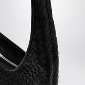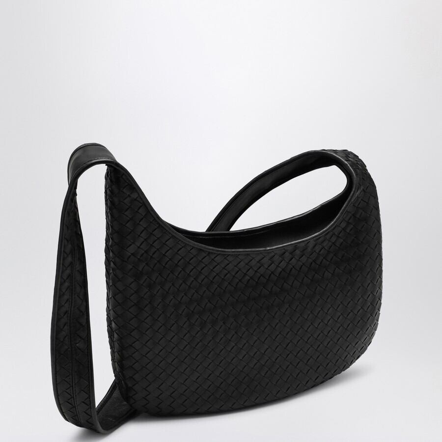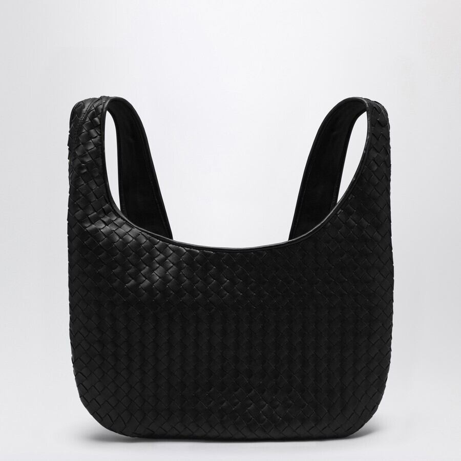 ボッテガ・ヴェネタのブラックのイントレチャート模様が特徴的なラムスキンのショルダーバッグ。丸みを帯びたシルエット、内側にジップポケット、ジップ開閉、スエードの内側、シルバーの金具が特徴です。
