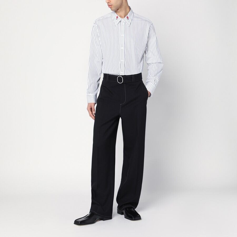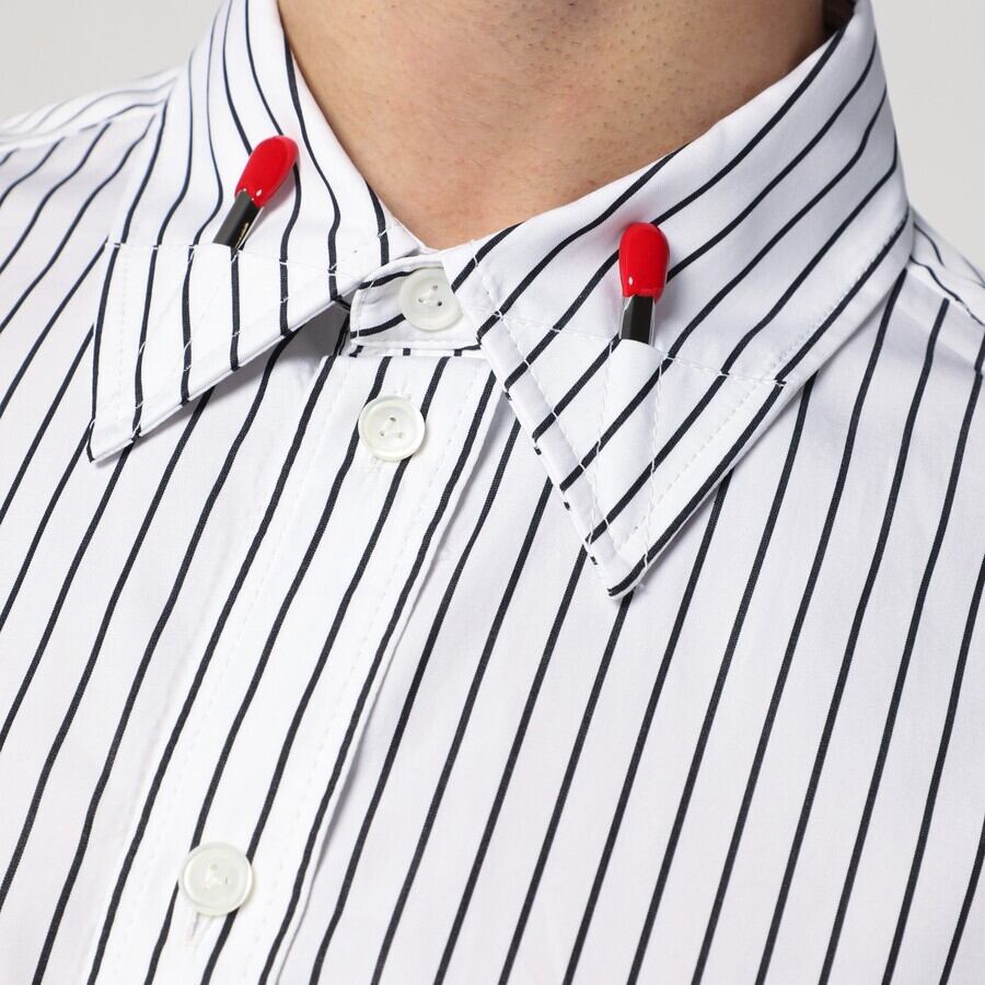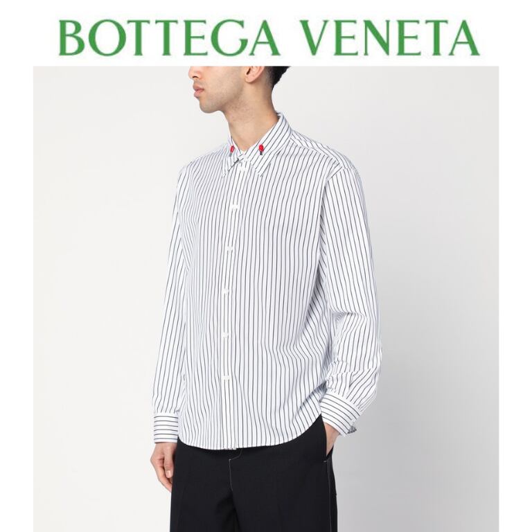 ボッテガ・ヴェネタのホワイトコットンシャツ。ブラックのストライプが入り、フロントボタン留め、ボタン留めの袖口が付いた長袖、カーブした裾、エナメルのマッチ棒型ディテールが施された襟が特徴です。