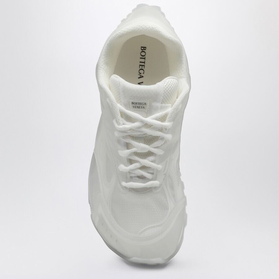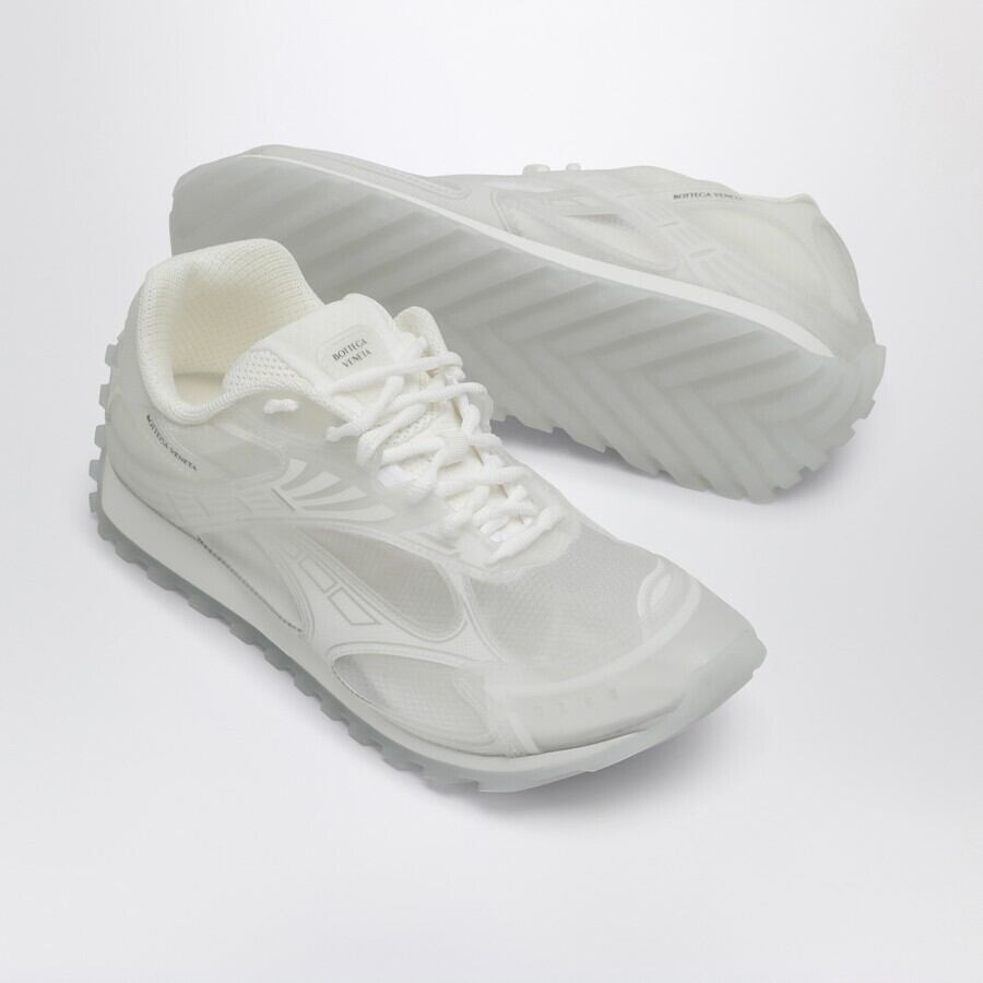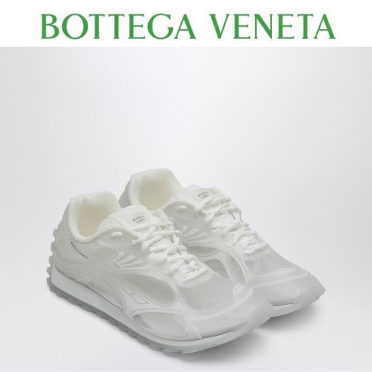 透明なテクニカルラバーとメッシュを使用したボッテガ・ヴェネタのスニーカー。ラウンドトゥ、サイドのロゴ、パッチ付きタン、シューレースクロージャー、ラバーソールが特徴です。