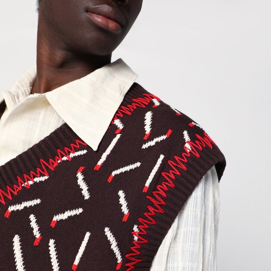 ボッテガ・ヴェネタのジレ。ブラウン、アイボリー、レッドのコットン混紡素材を使用し、ジャカード織りのマッチスティック柄を全体にあしらっています。Vネックとリブ編みのエッジが特徴です。