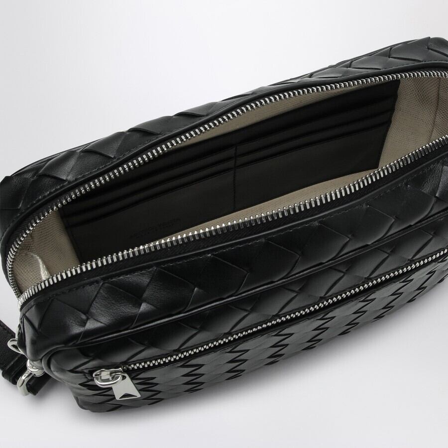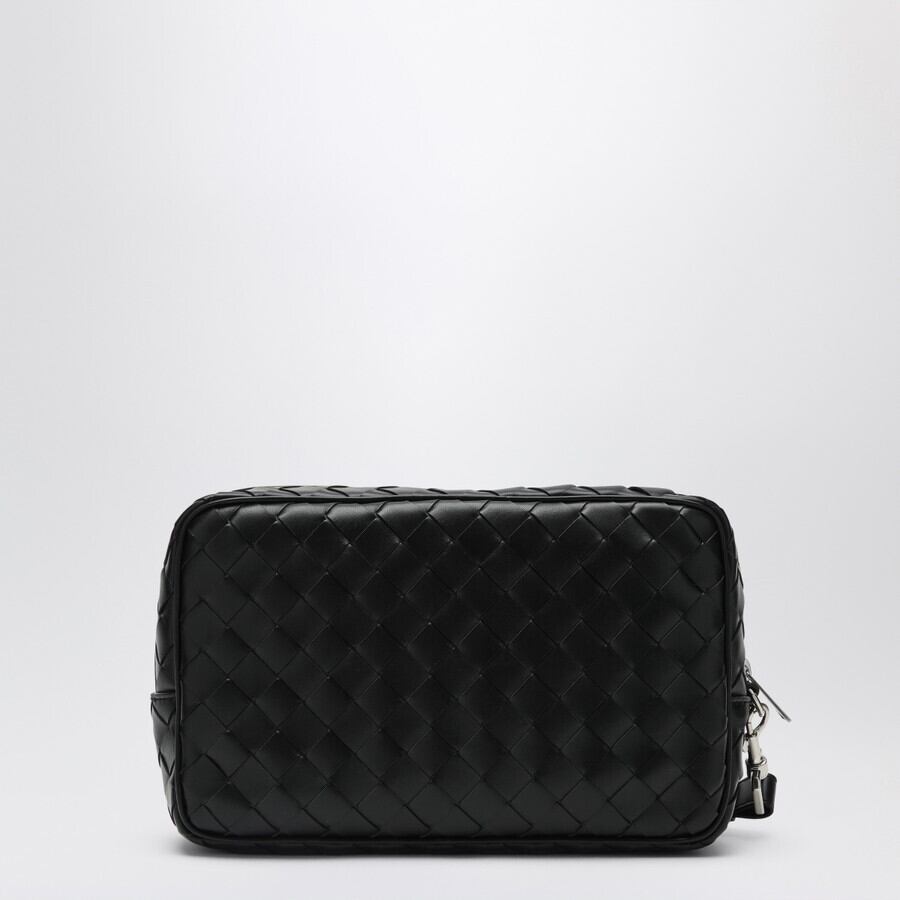 ボッテガ・ヴェネタのブラックカーフスキン製ポーチ。イントレチャートの細工が特徴で、シングルコンパートメント、クレジットカードスロット6つ、外側にジップポケット1つ、ジップ開閉、キャンバス地の内側、シルバーの金具が特徴です。
