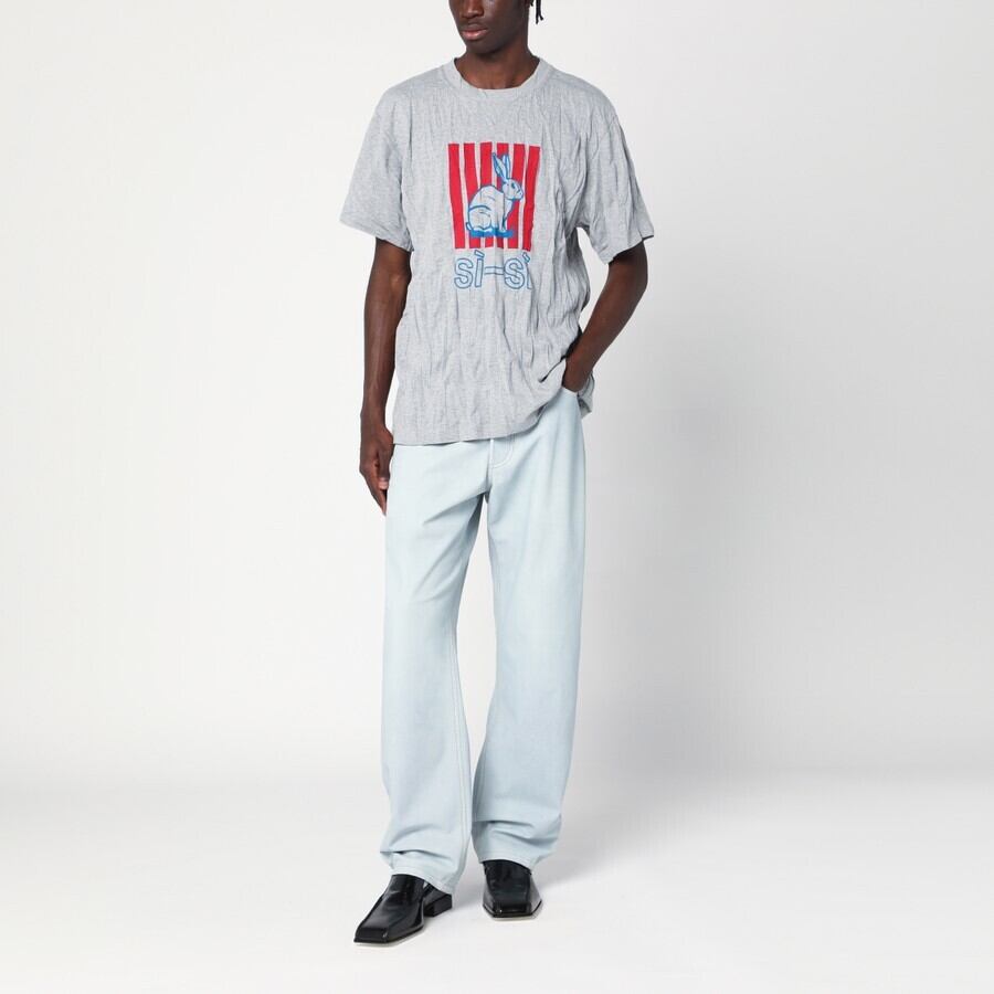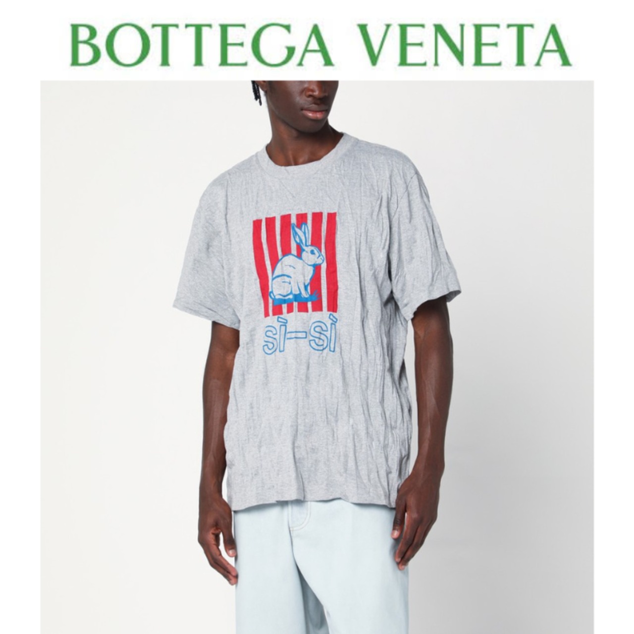 ボッテガ・ヴェネタのTシャツ。クラッシュ加工を施したグレーのテクニカルコットンジャージー混紡素材を使用。グラフィックなラビットプリント、Si-Siプリント、クラッシュ加工が施され、レギュラーフィットです。
