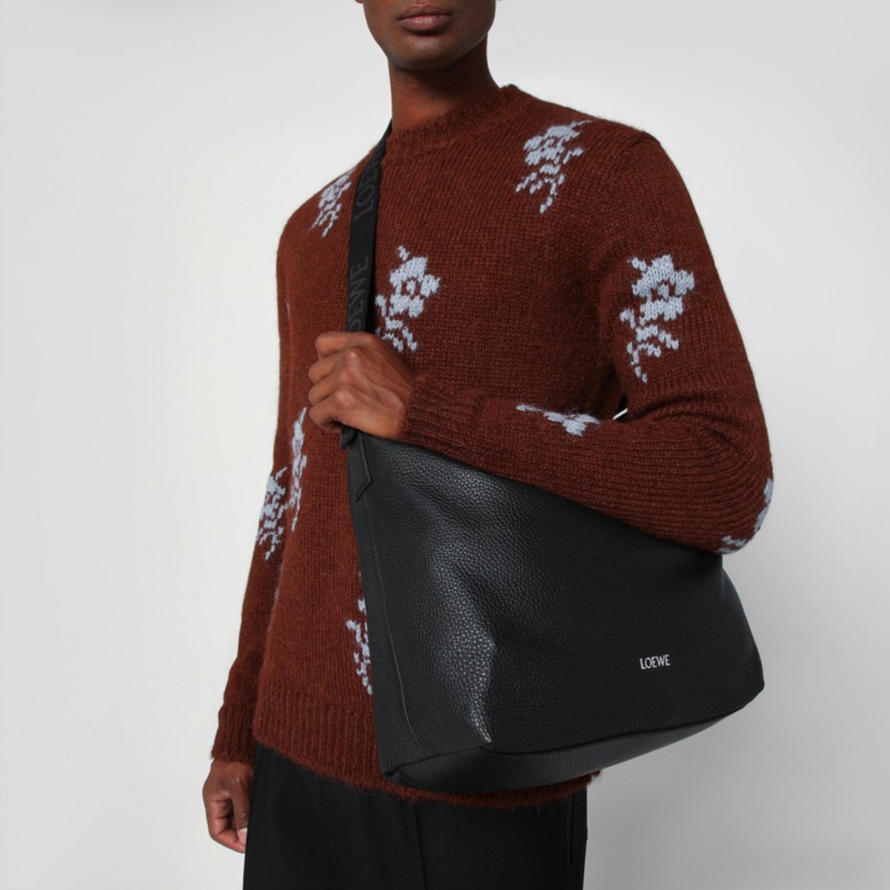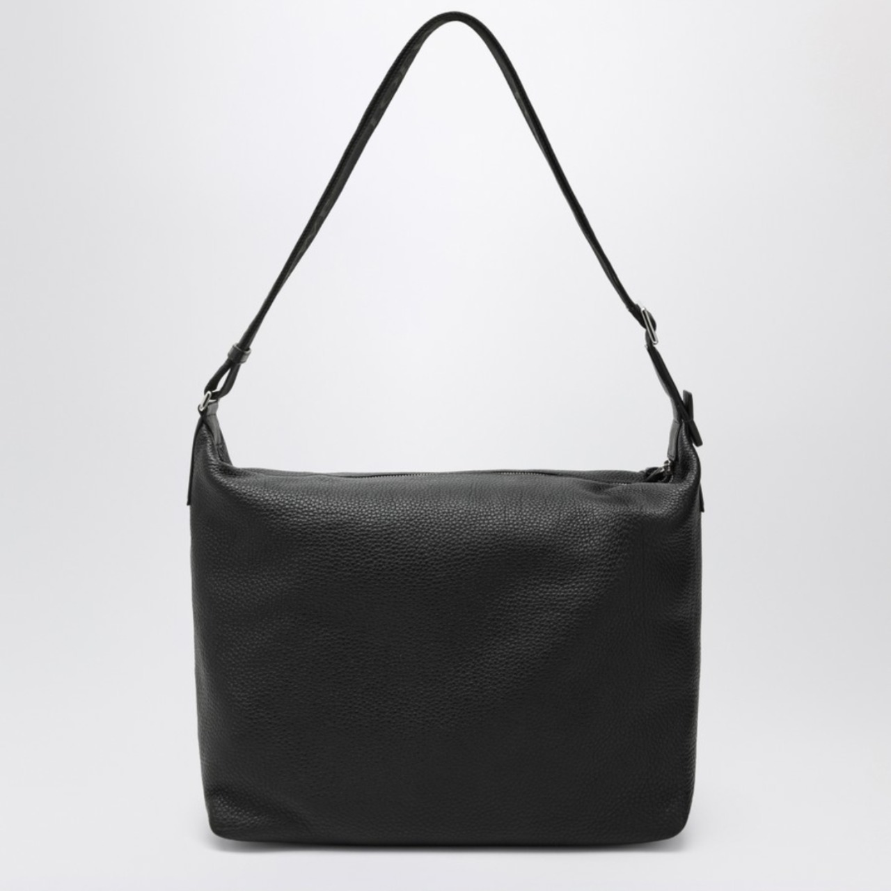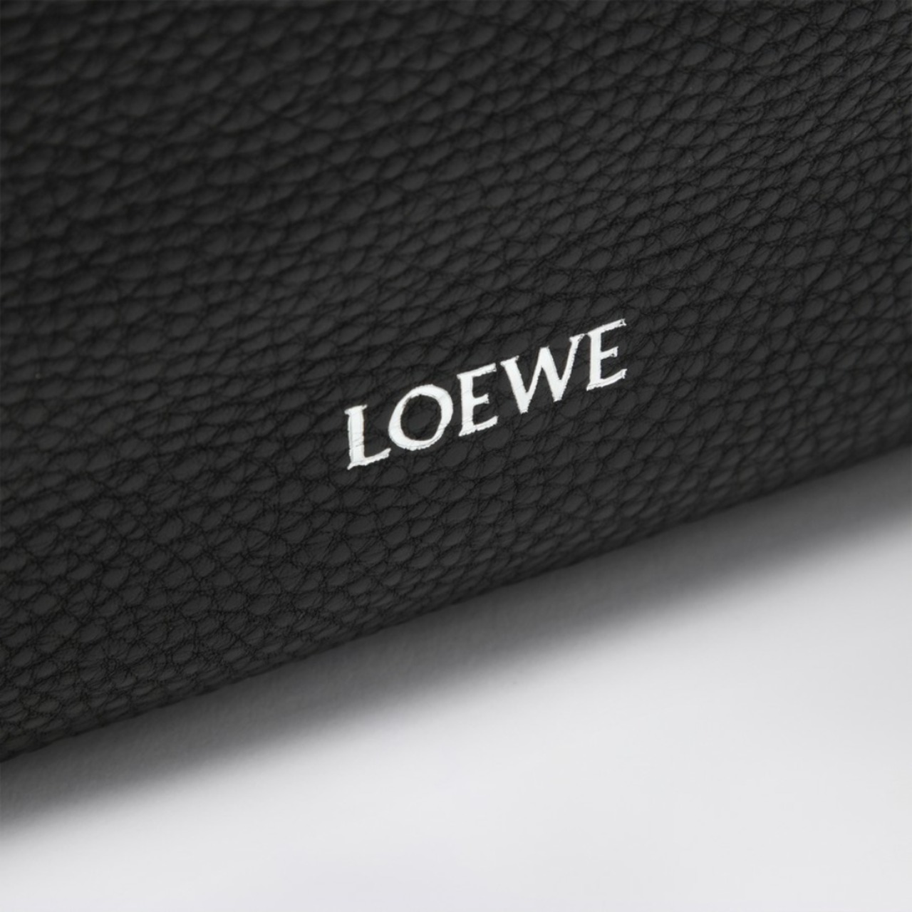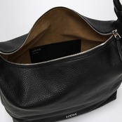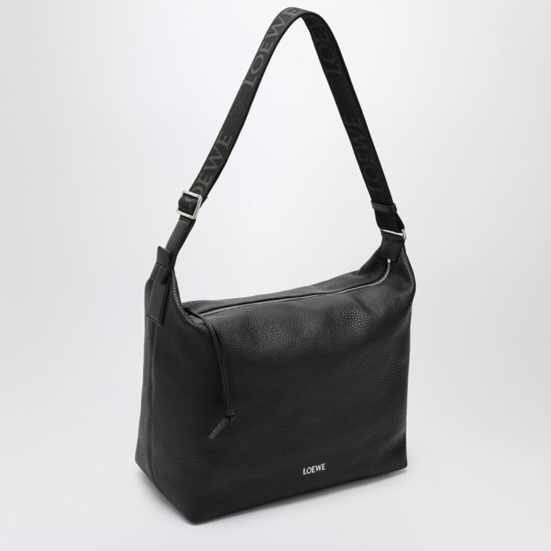 ロエベのブラックグレインカーフスキンレザー製ショルダーバッグ。ロゴ入りの調節可能なウェビングショルダーストラップ、フロントにエンボスロゴ、ジッパー開閉、内オープンポケットが特徴です。