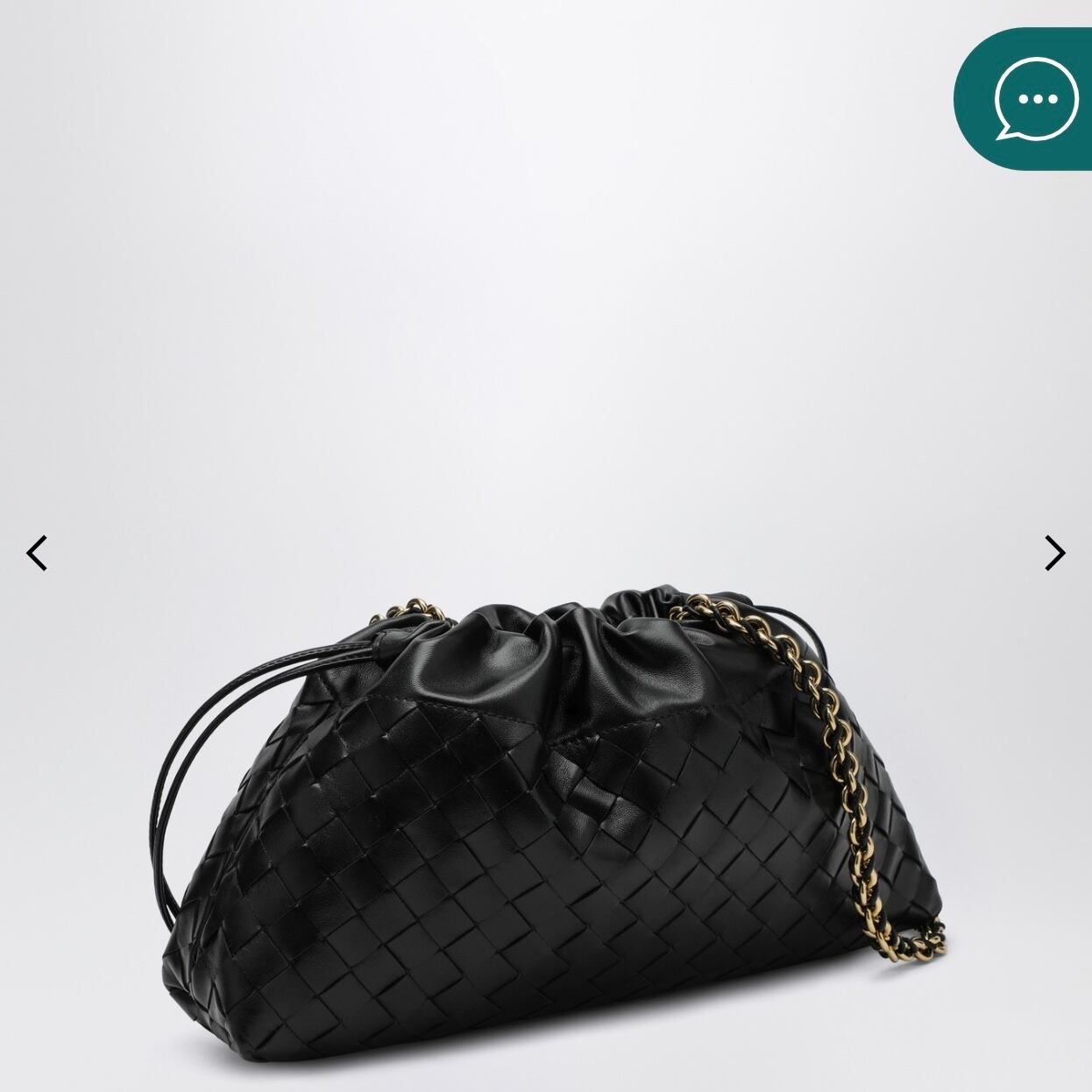 イントレチャート模様が特徴のブラックカーフスキン製ボッテガ・ヴェネタポーチ。 メインコンパートメント1つ、ドローストリング開閉、レザーと織りメタルチェーンの ショルダーストラップ、ナイロン製の内側、真鍮色の金具付き。
