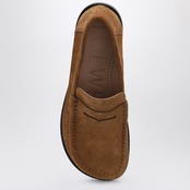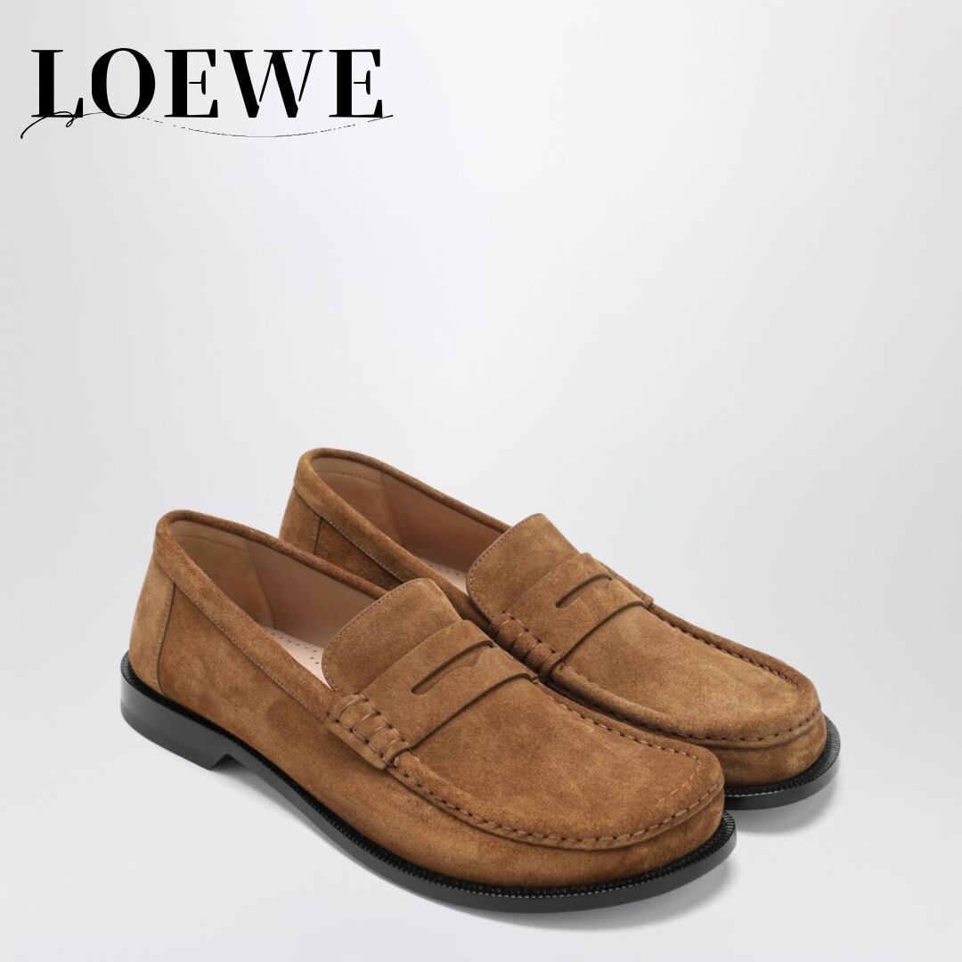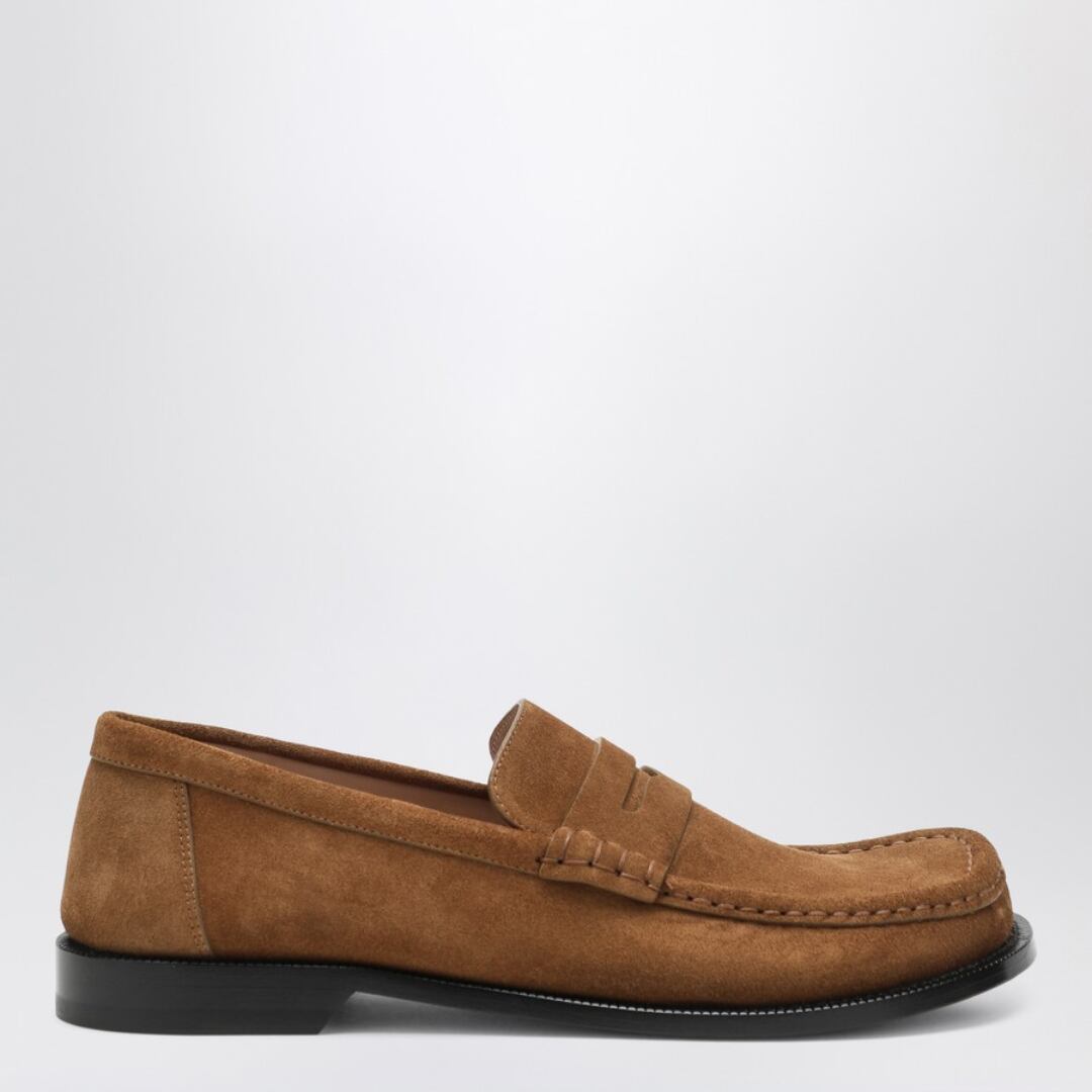 タバコ色のスエードを使用したロエベのモカシン。非対称の花びら型の丸いつま先、トーンオントーンのステッチ、レザーソールが特徴です。