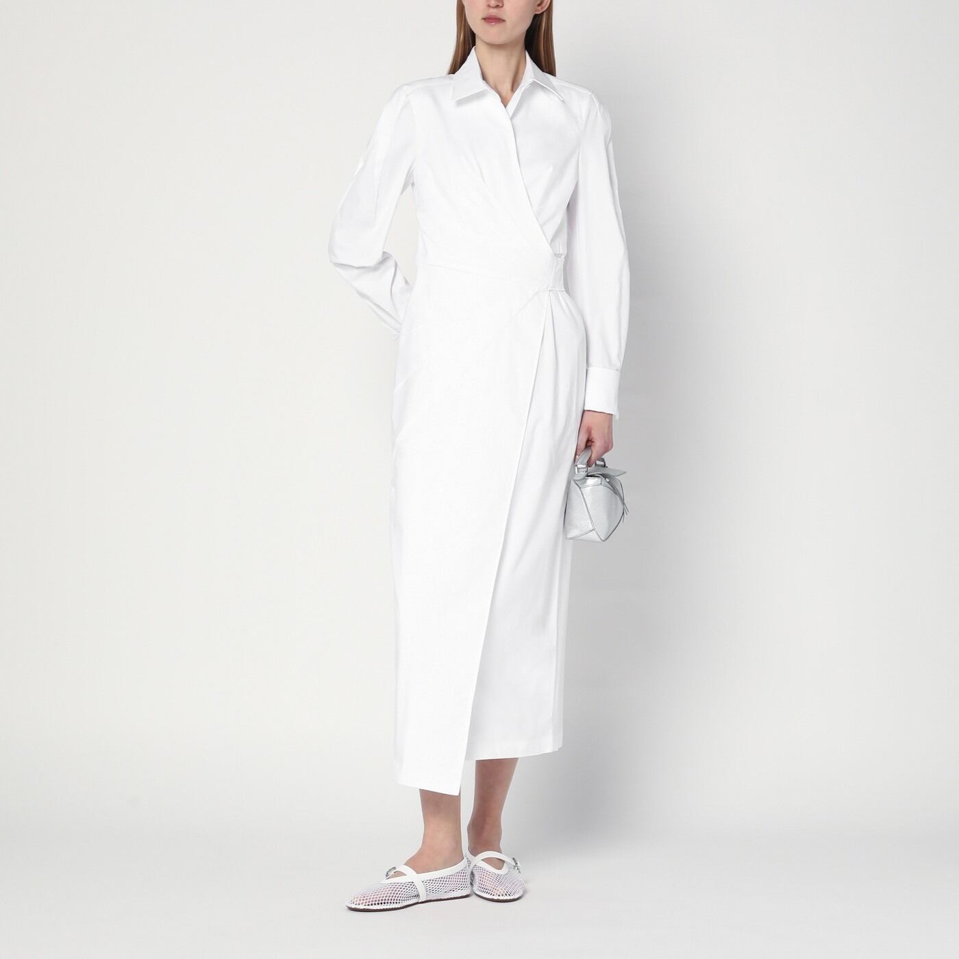 Max Maraのホワイトストレッチコットンツイルを使用したロング丈のシュミジェドレス。裏地なしのフィット感、シャツカラー、ハイカフスとカフスボタン付きの長袖、ウエストにアシンメトリープリーツを施したラップクロージャー、そしてバックにスナップボタンで結ぶサッシュが特徴です。