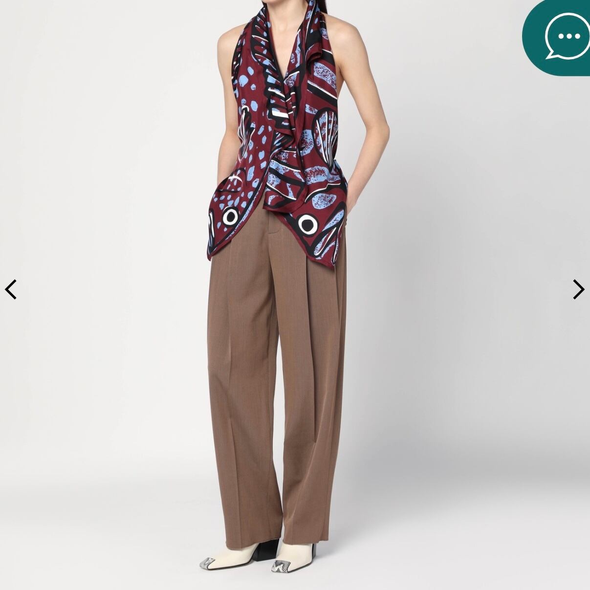ボッテガ・ヴェネタのトップス。バーガンディとブルーの色合いのプリントシルク ツイルを使用。魚の形をしたデザイン、Vネック、オープンバックが特徴です。 背面にはクリップで調節可能なタイが付いています。