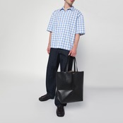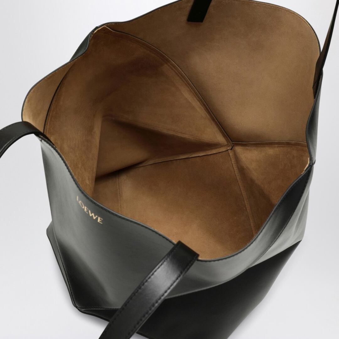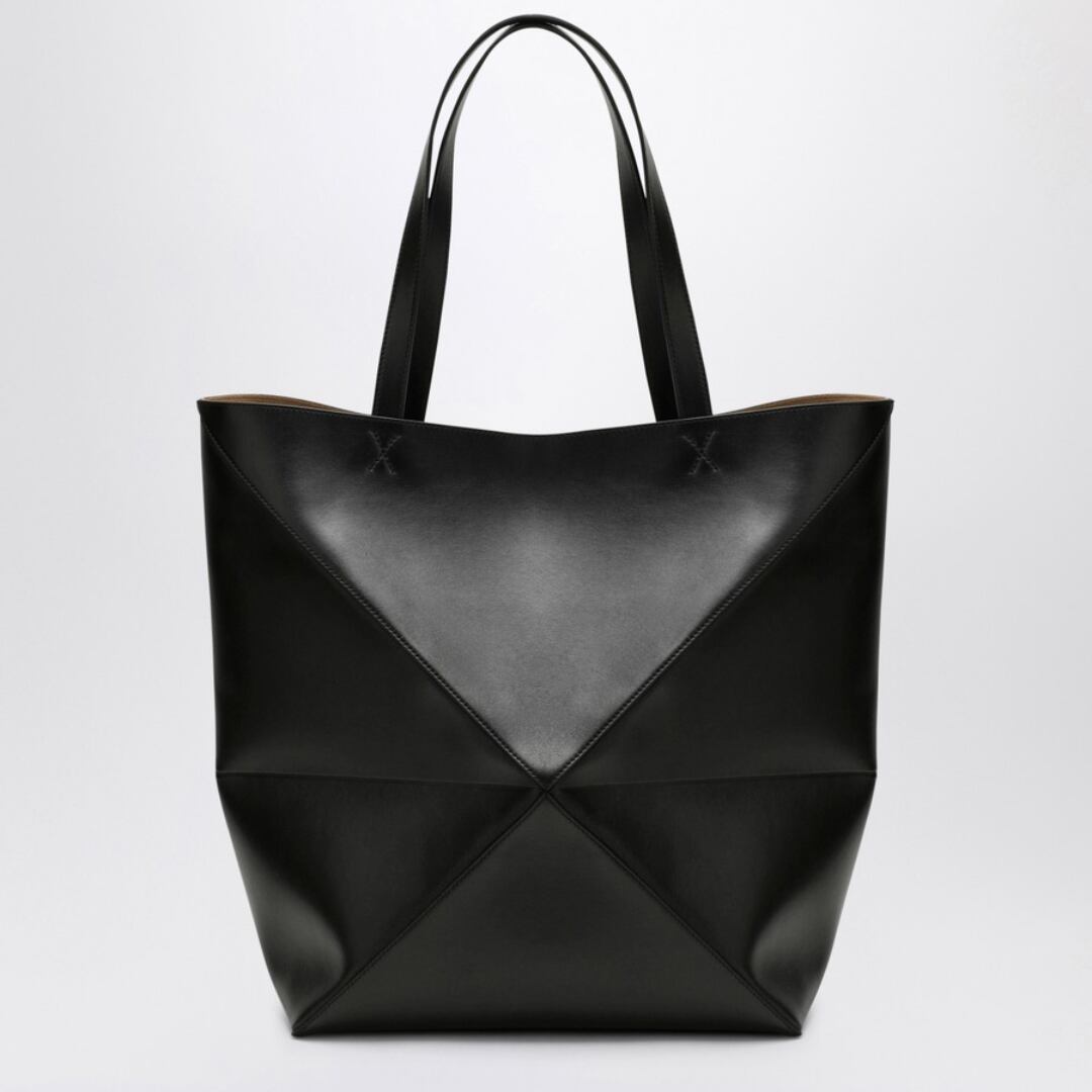 光沢のあるブラックのカーフスキンレザーを使用した、ロエベの大型トートバッグ。折りたたみ式の幾何学模様のデザイン、2 つのトップハンドル、スエードの裏地、前面のゴールドのエンボス加工ロゴ文字が特徴です。