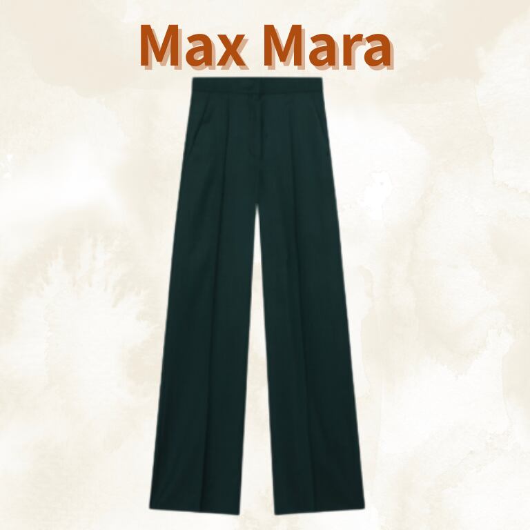マックスマーラのグリーンウール製ストレートパンツ。ワイドフィット、ハイウエスト、背面に刺繍ロゴ、フック付きジップ開閉、サイドウェルトポケット、プレスクリースディテールが特徴です。