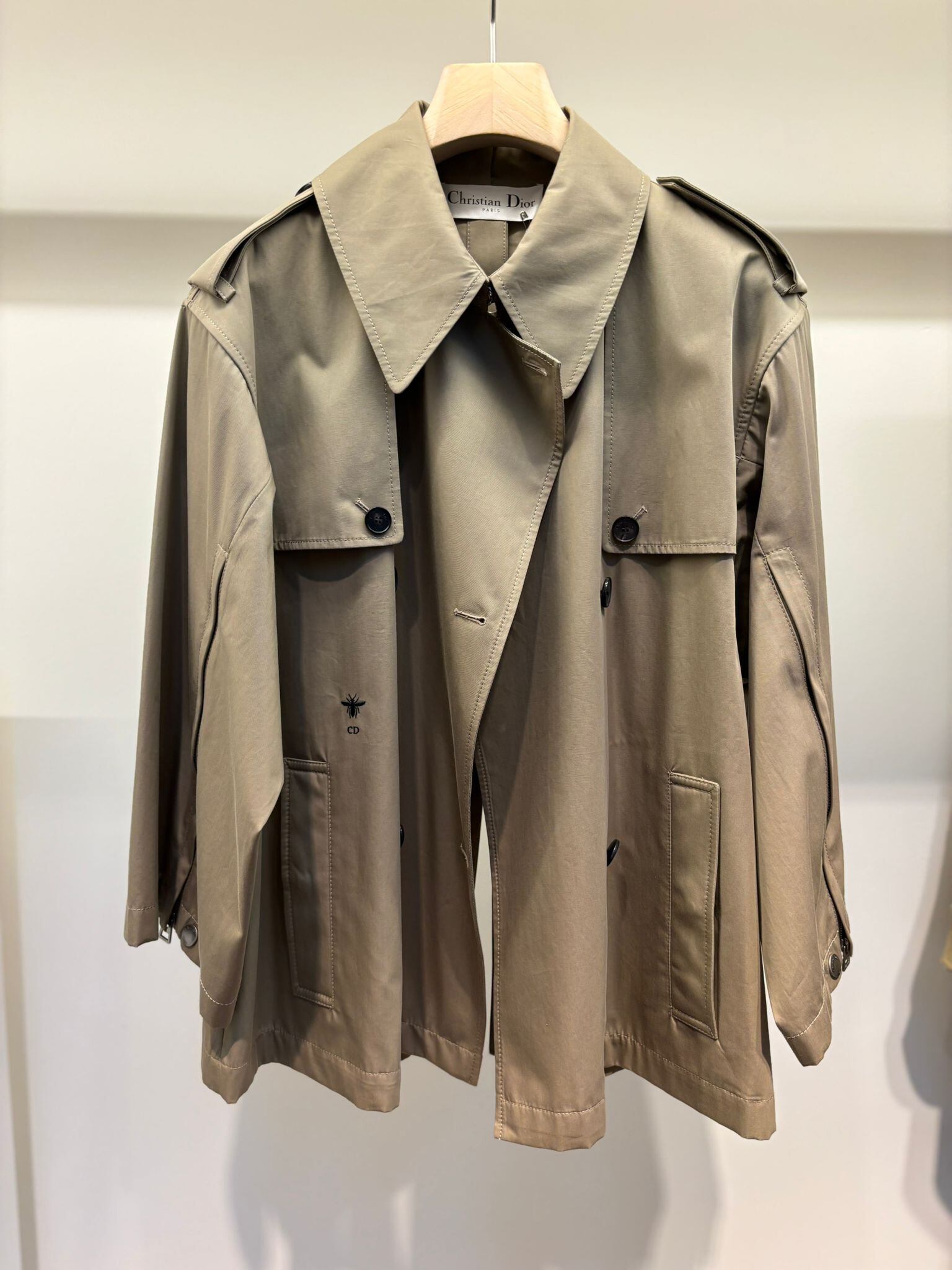 説明:クラシックビーとCDのロゴ刺繍、6ボタンのダブルブレスト開閉、クリスチャンディオールパリホーンバックル、肩に調節可能なボタンループ、フロントショルダーと胸のオーバーレイデザイン、ジッパーディテールで装飾された袖、中央背中のスリット、裏地なし。
