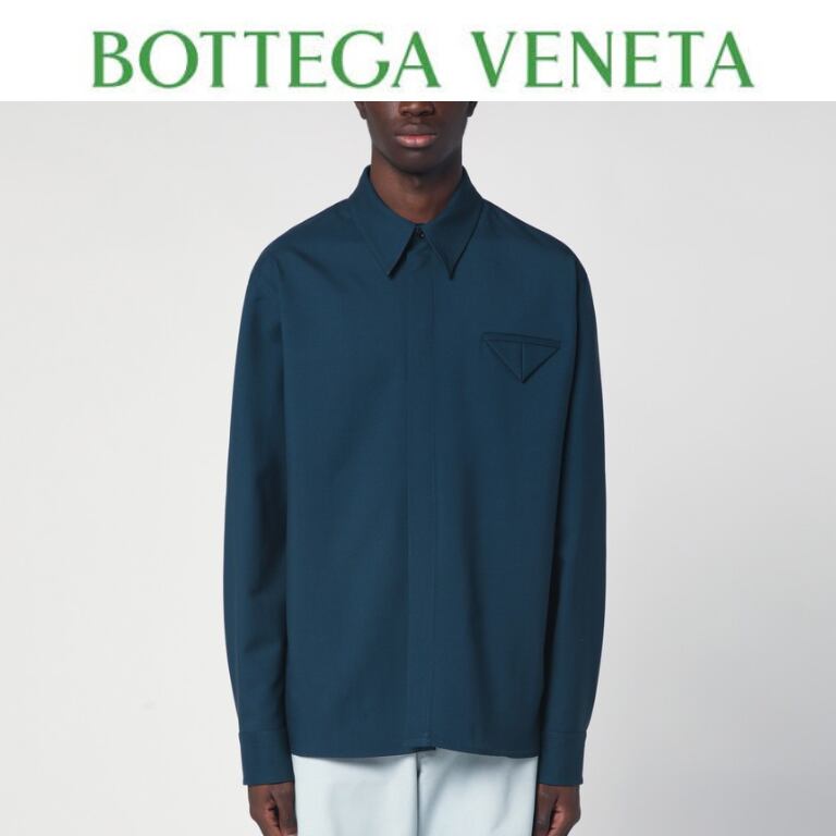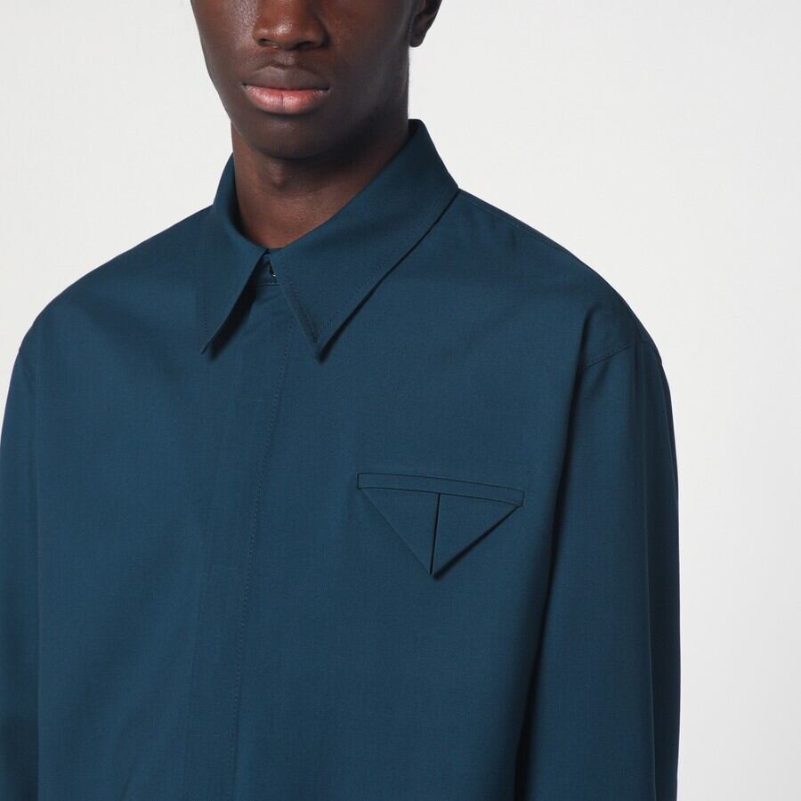 ボッテガ・ヴェネタのペトロールブルーのウールシャツ。クラシックな襟、隠しフロントボタン、三角形のフラップ付き胸ポケット、そしてボタン留めの袖口が付いた長袖が特徴です。
