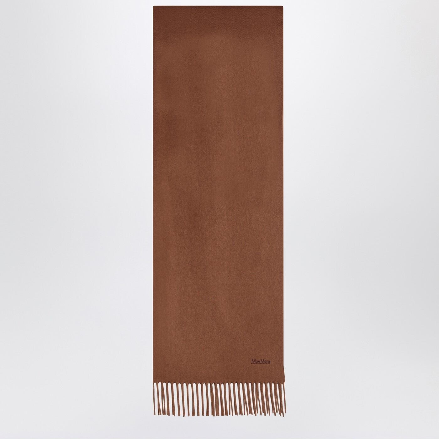 マックスマーラのレザーカラーのカシミアスカーフ。フリンジの縁取りとトーンオントーンの刺繍ロゴが特徴です。
