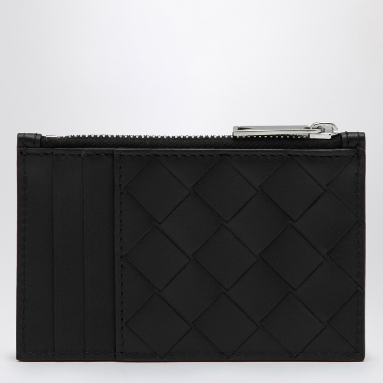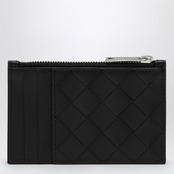 ボッテガ・ヴェネタのカードケース。イントレチャート模様のブラックレザーを使用。クレジットカードスロット6つ、ジップ付きポケット、シルバー仕上げのメタルパーツが特徴です。