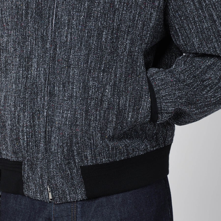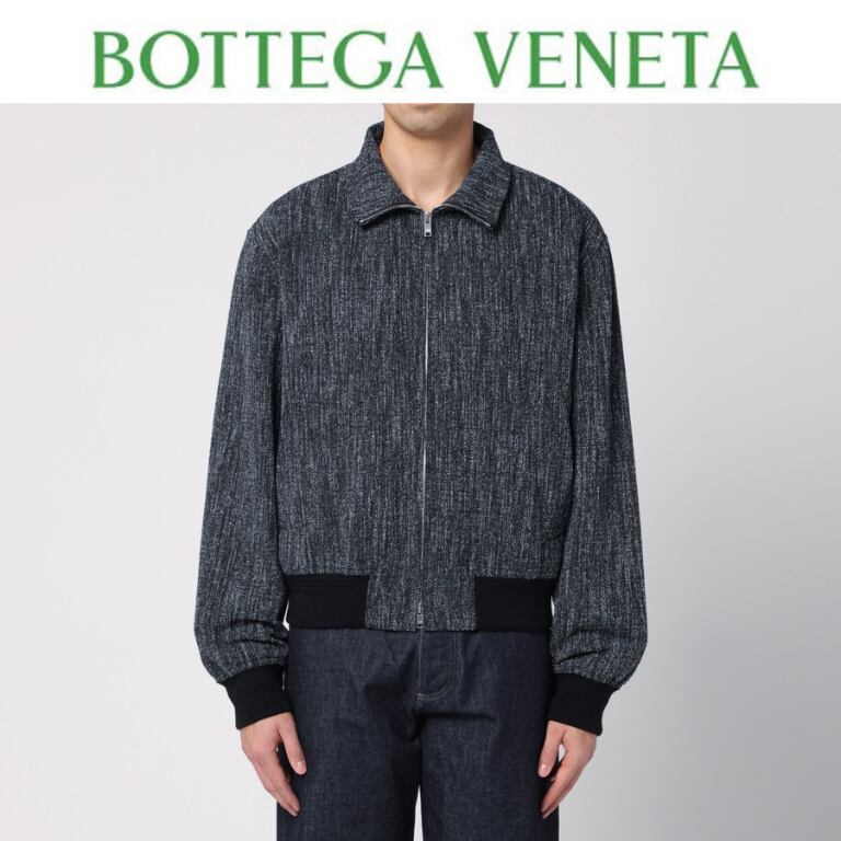 ボッテガ・ヴェネタのグレーのテクスチャードウール、コットン、ビスコース混紡ボンバージャケット。長袖、ハイカラー、フロントジップ、両サイドのウェルトポケット、リブ編みのニットエッジが特徴です。