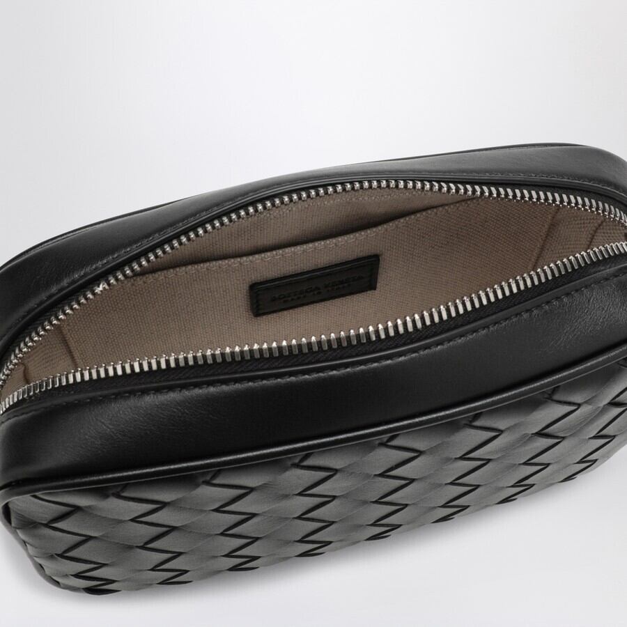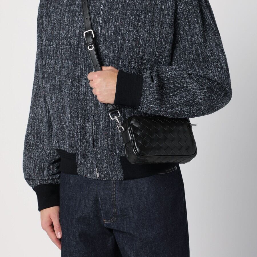 ボッテガ・ヴェネタのミニクロスボディバッグ。ブラックレザーのイントレチャート模様。調節・取り外し可能なレザーショルダーストラップ、ジップ開閉、内側にフラットポケット、キャンバスライニングが特徴です。