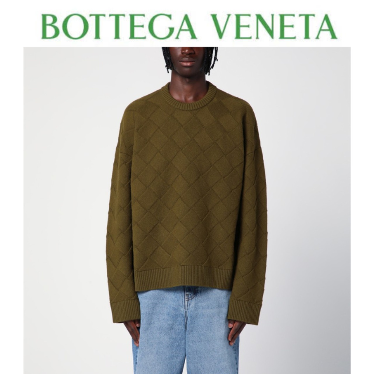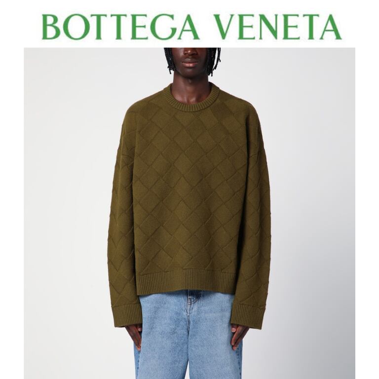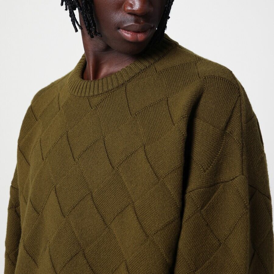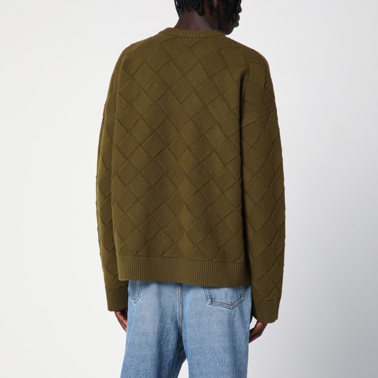 ボッテガ・ヴェネタのオリーブグリーンのウール混紡クルーネックセーター。3Dイントレッチオ模様、長袖、リブ編みの裾、レギュラーフィットが特徴です。