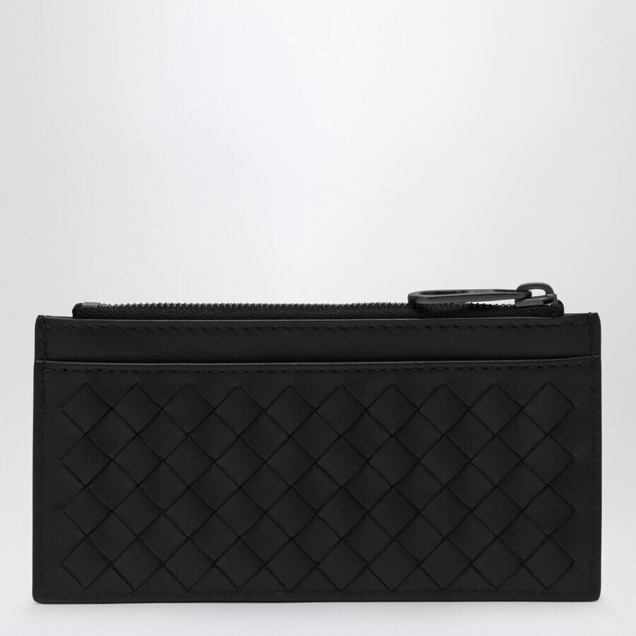 ボッテガ・ヴェネタのイントレチャート模様が美しいブラックレザーのカードケース。ジップ付きポケットと複数のカードスロットを備えています。