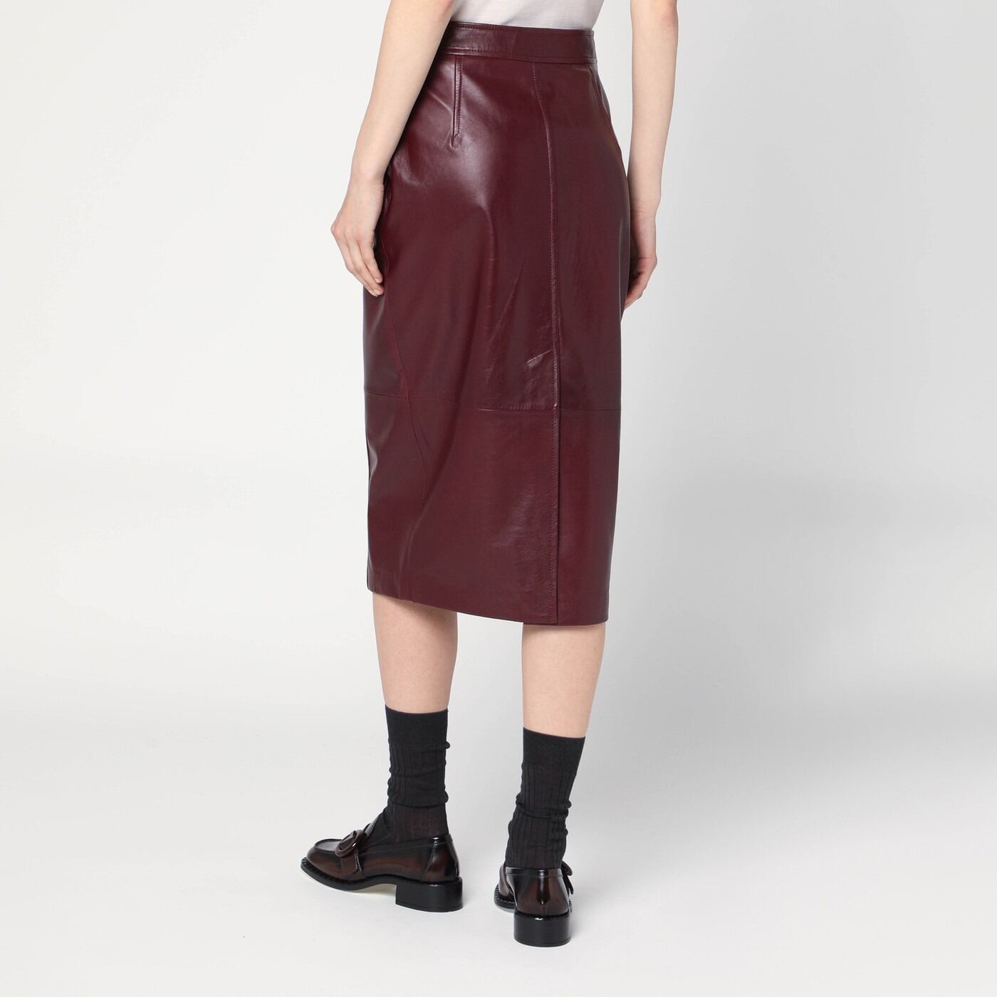 Max Mara Studioのボルドーレザーペンシルスカート。縦方向のヴォールトステッチ、ハイウエスト、ラテラルジップ留め、フィット感のあるシルエット、バックセンタースリットが特徴です。