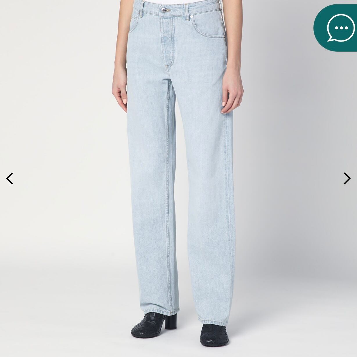 ボッテガ・ヴェネタのライトブルーコットンデニムジーンズ。クラシックな5つの ポケット、背面にイントレチャート柄のスエードパッチ、ジッパーとボタンの フロント開閉、ベルトループが特徴です。