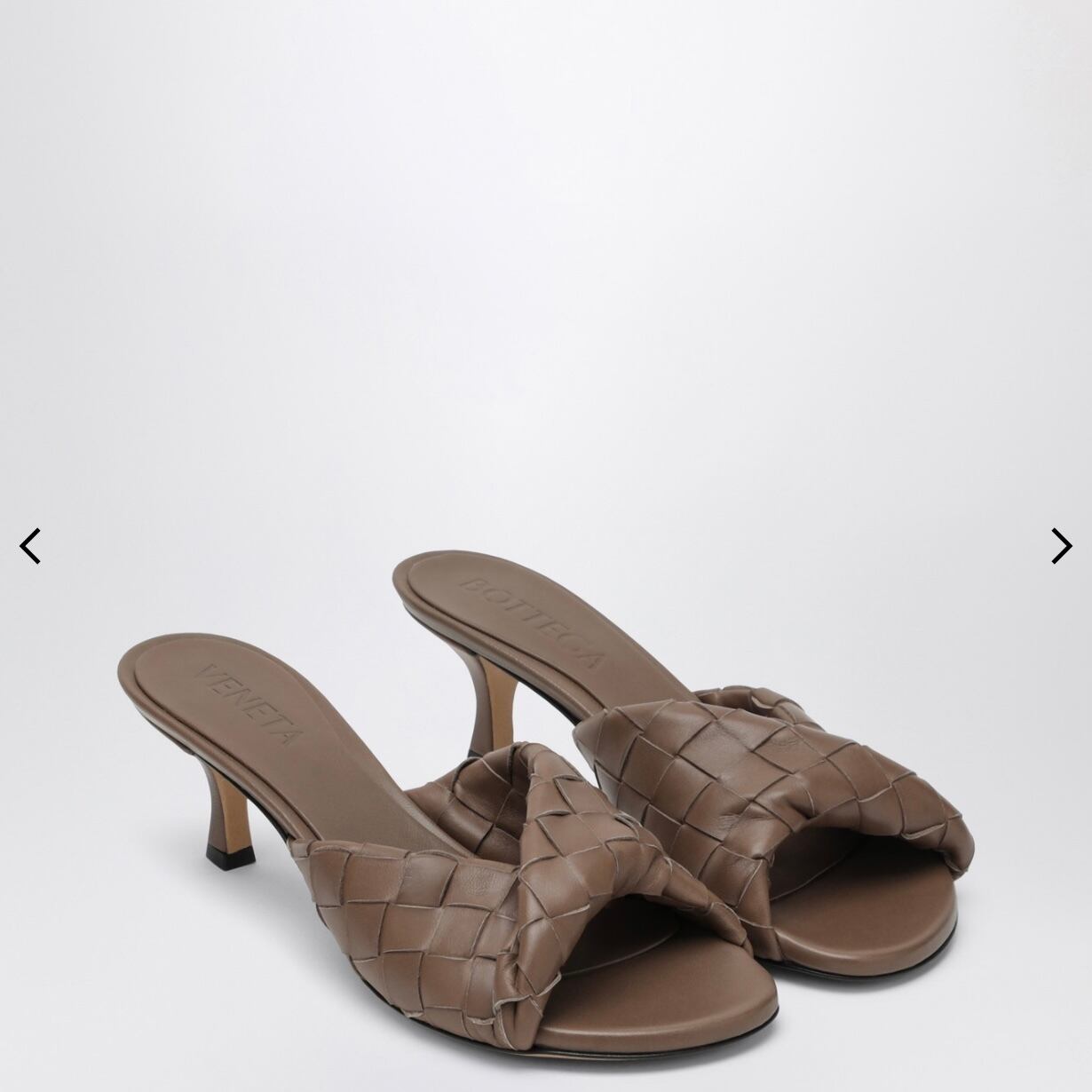 ボッテガ・ヴェネタのブラウンレザーミュール。イントレチャート模様。フロント の折り返しディテール、ロゴ刻印入りのインソール、レザーとラバーソール が特徴です。