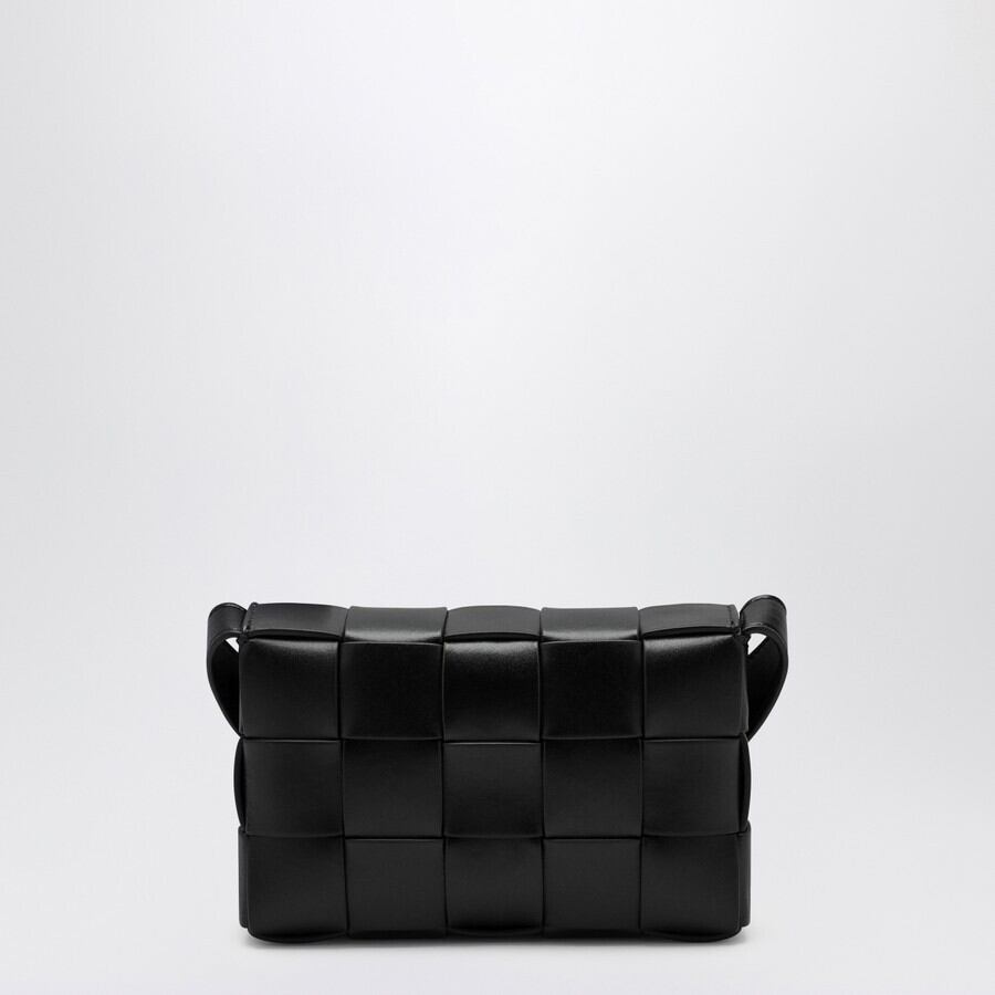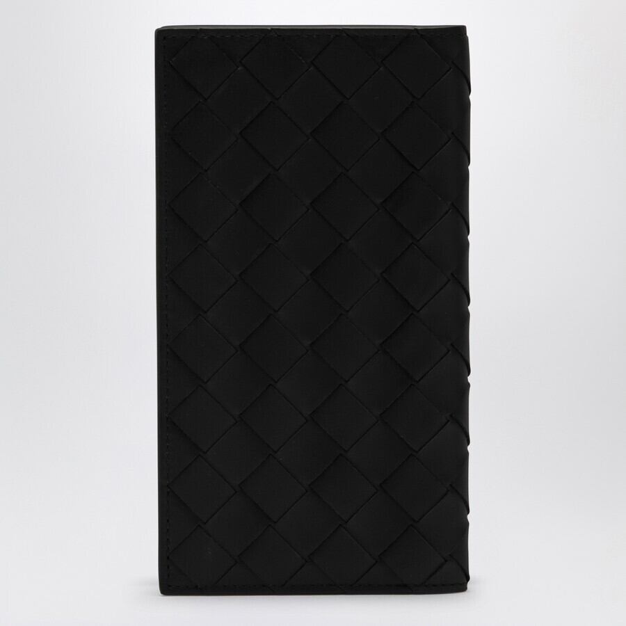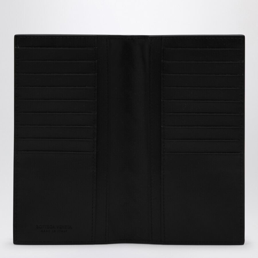 ボッテガ・ヴェネタのブラックレザー製縦型カードホルダー。イントレチャート模様と、内側に18個のカードスロット、サイドスロットを備えています。
