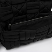 ボッテガ・ヴェネタのクロスボディバッグ。ブラックのナイロン素材に、内側はコントラストの効いたグリーン。パッド入りのイントレチャートモチーフが斜めにあしらわれ、内側には取り外し可能なジップポケット、マグネット開閉式、長さ調節可能なショルダーストラップ、シルバートーンのメタル金具が特徴です。