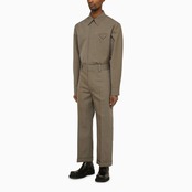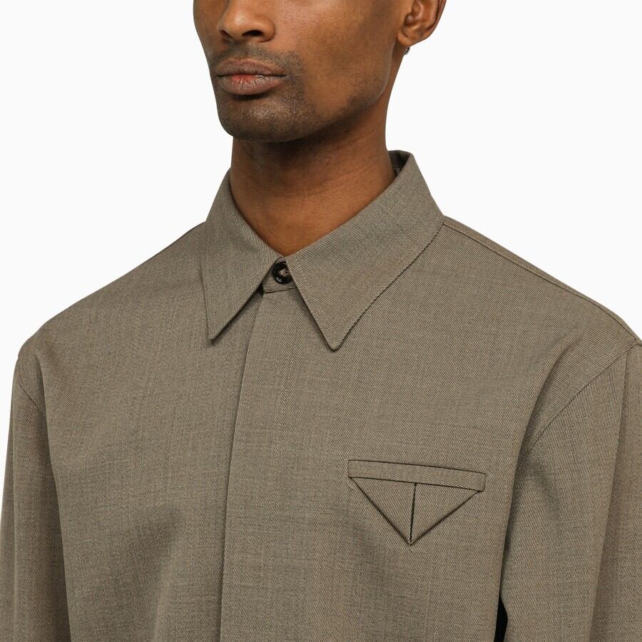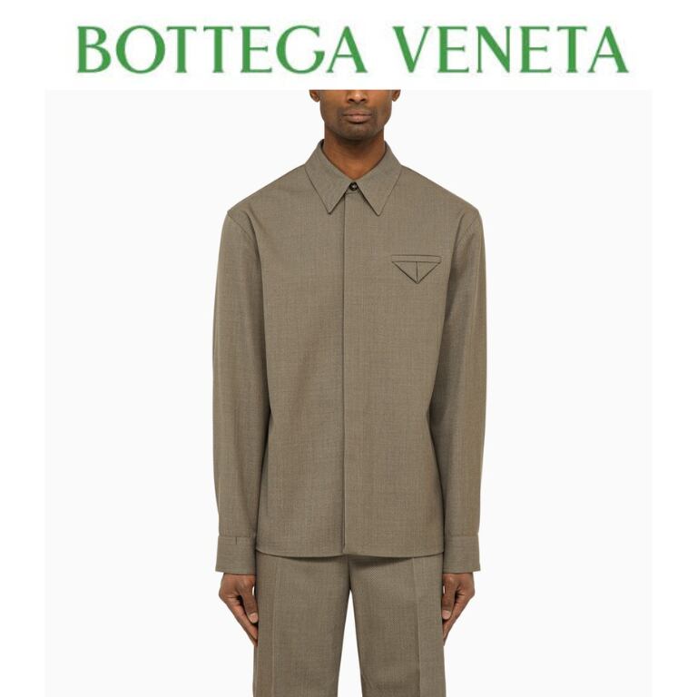 ボッテガ・ヴェネタのグレーウールツイルシャツ。クラシックな襟、隠しボタン留めのフロントプラケット、三角形の胸ポケット、長袖、ボタンカフスが特徴です。