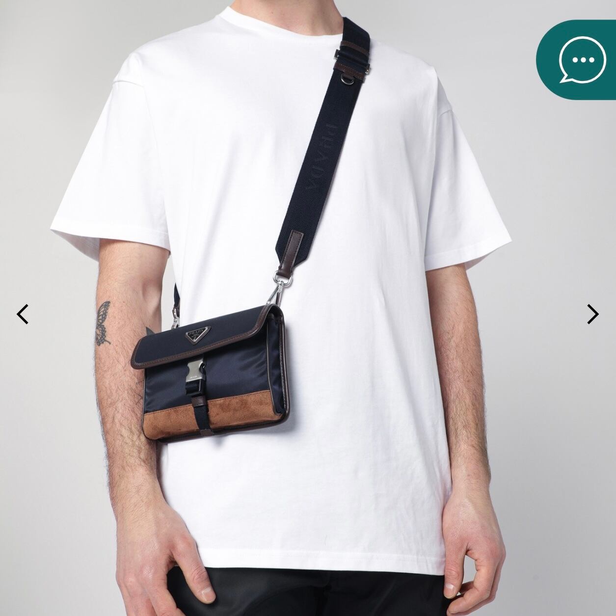 プラダのブルーRe-Nylon製スマートフォンホルダー。サフィアーノレザー のディテール、ロゴ入りカラビナ付きフラップ開閉、前面にエナメル加工のメタル トライアングルロゴ、ブラウンのスエードレザーインサート、内側にカードスロット1 つ、調節・取り外し可能なリボンショルダーストラップが特徴です。