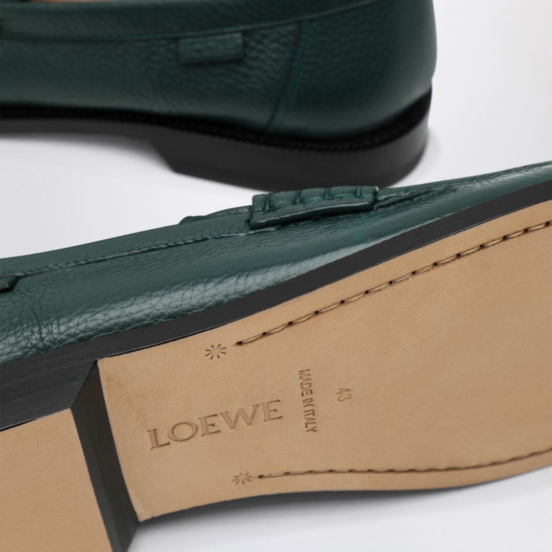 ダークグリーンの鹿革を使用したロエベのモカシン。非対称の花びら型の丸いつま先、トーンオントーンのステッチ、レザーソールが特徴です。