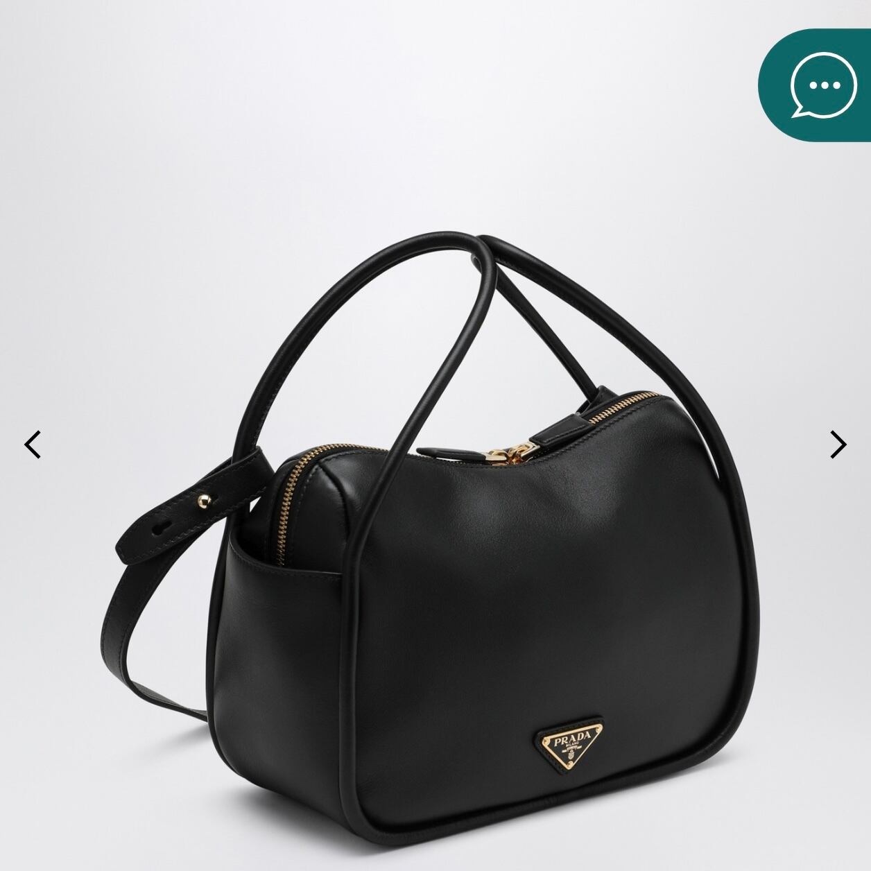 プラダのソフトグレインレザー製ハンドバッグ(ブラック)。ダブルハンドル、 取り外し可能なショルダーストラップ、2つのオープンサイドポケット、ゴールドメタルの 金具、フロントのエナメルメタルロゴトライアングル、ジップ開閉、フラットな内ポケット1つ、 シグネチャーナイロンの内側が特徴です。