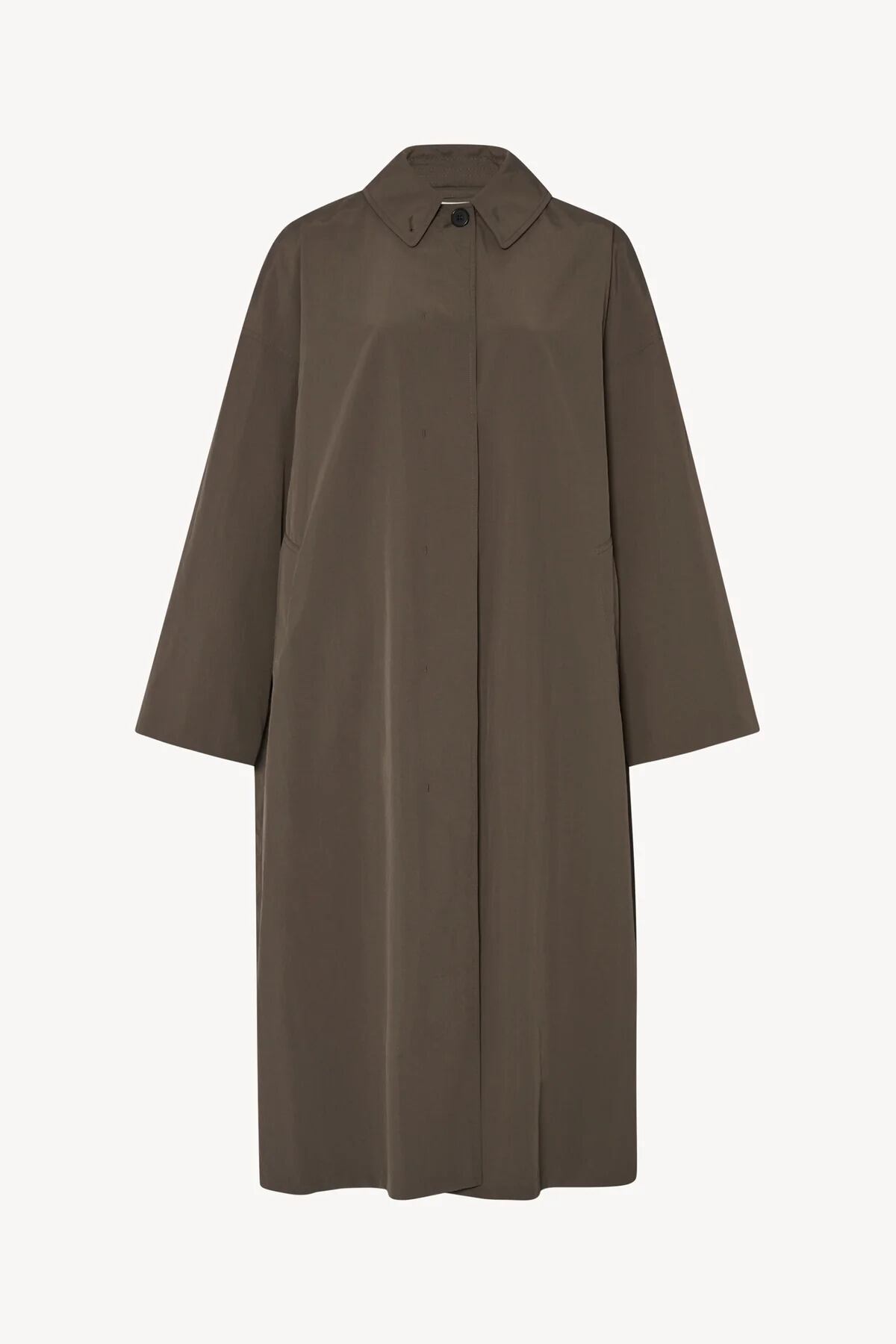 ウォッシュ加工を施した軽量ナイロン製の足首丈トレンチコート。オーバーサイズのフィット感、斜めのウェルトポケット、ホーンボタン留めの隠しフロントプラケットが特徴。