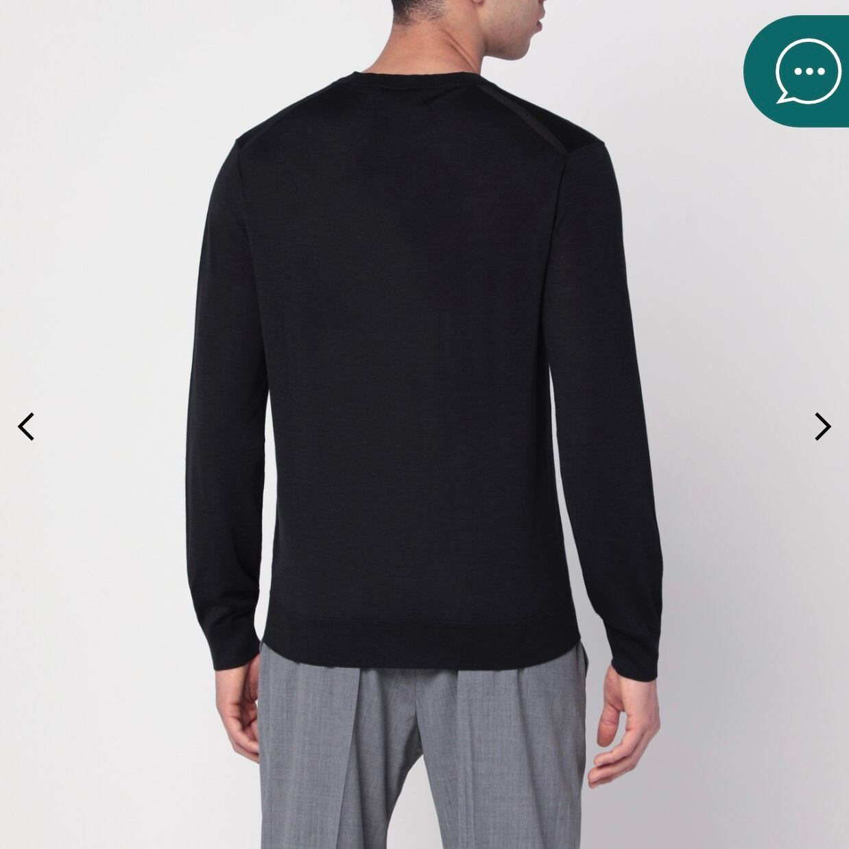 プラダのブラックバージンウールクルーネックセーター。長袖、リブ編みのトリム、 胸元にコントラストの効いたレタリングロゴが特徴です。
