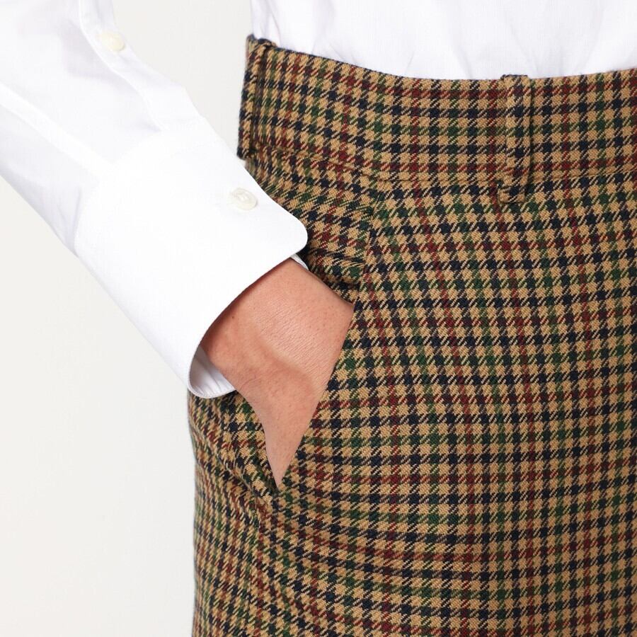 ベージュのチェック柄ウールを使用したサンローランのミディキュロット。ミッドライズ、ベルトループ付き、サイドにウェルトポケット 2つ、シルクの地、ジッパー、背面にフックとアイの留め具、ボタン付きの背面ウェルトポケット2つが特徴です。